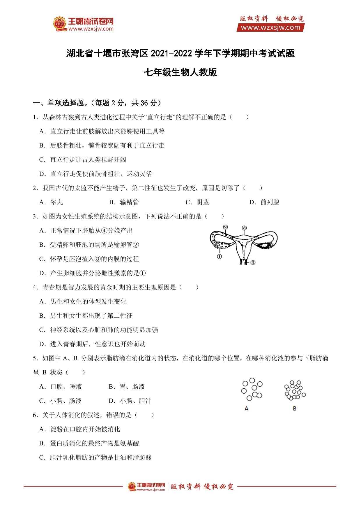 湖北省十堰市张湾区2021-2022学年下学期期中考试试题七年级生物(人教版)