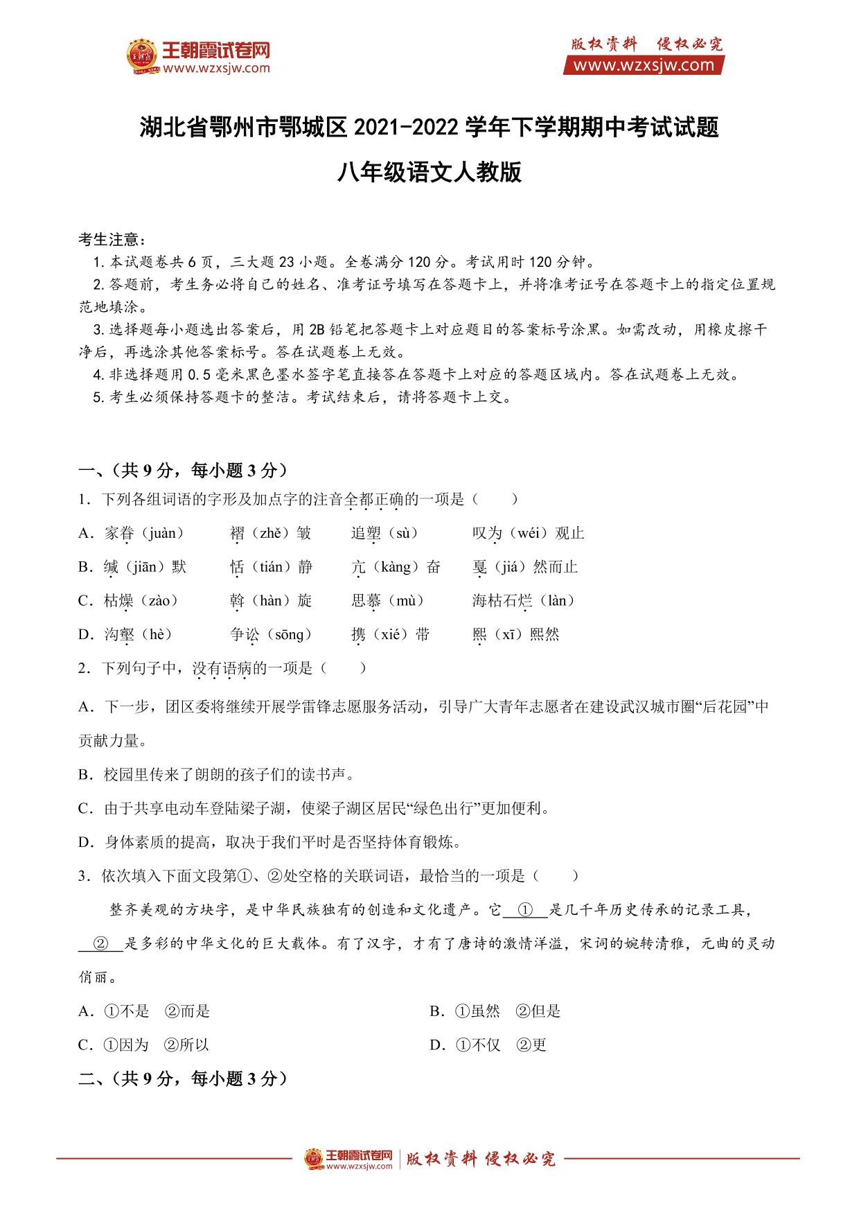 湖北省鄂州市鄂城区2021-2022学年下学期期中考试试题八年级语文(人教版)