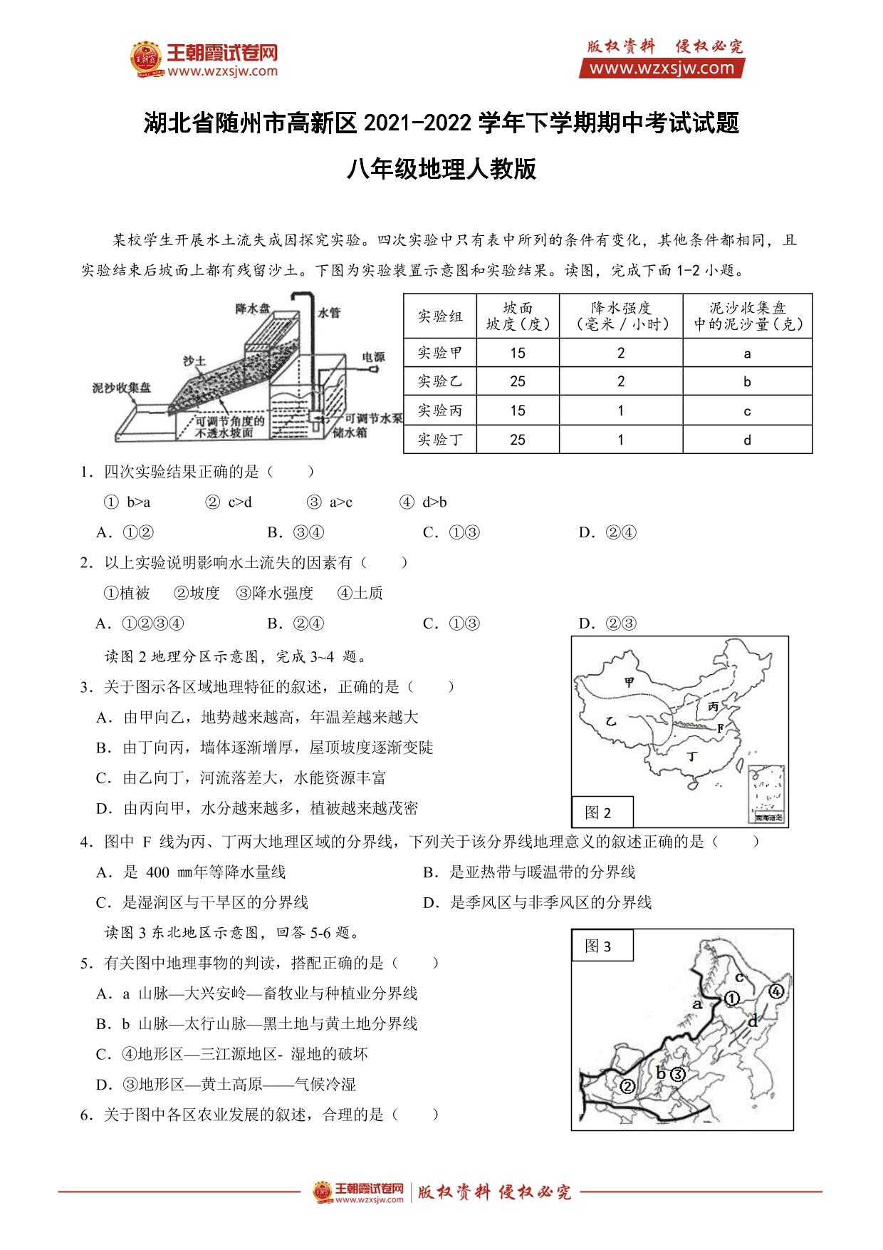 湖北省随州市高新区2021-2022学年下学期期中考试试题八年级地理(人教版)正文