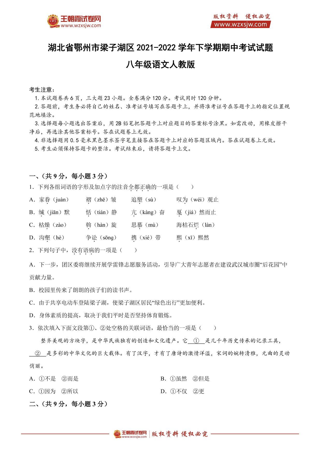 湖北省鄂州市梁子湖区2021-2022学年下学期期中考试试题八年级语文(人教版)