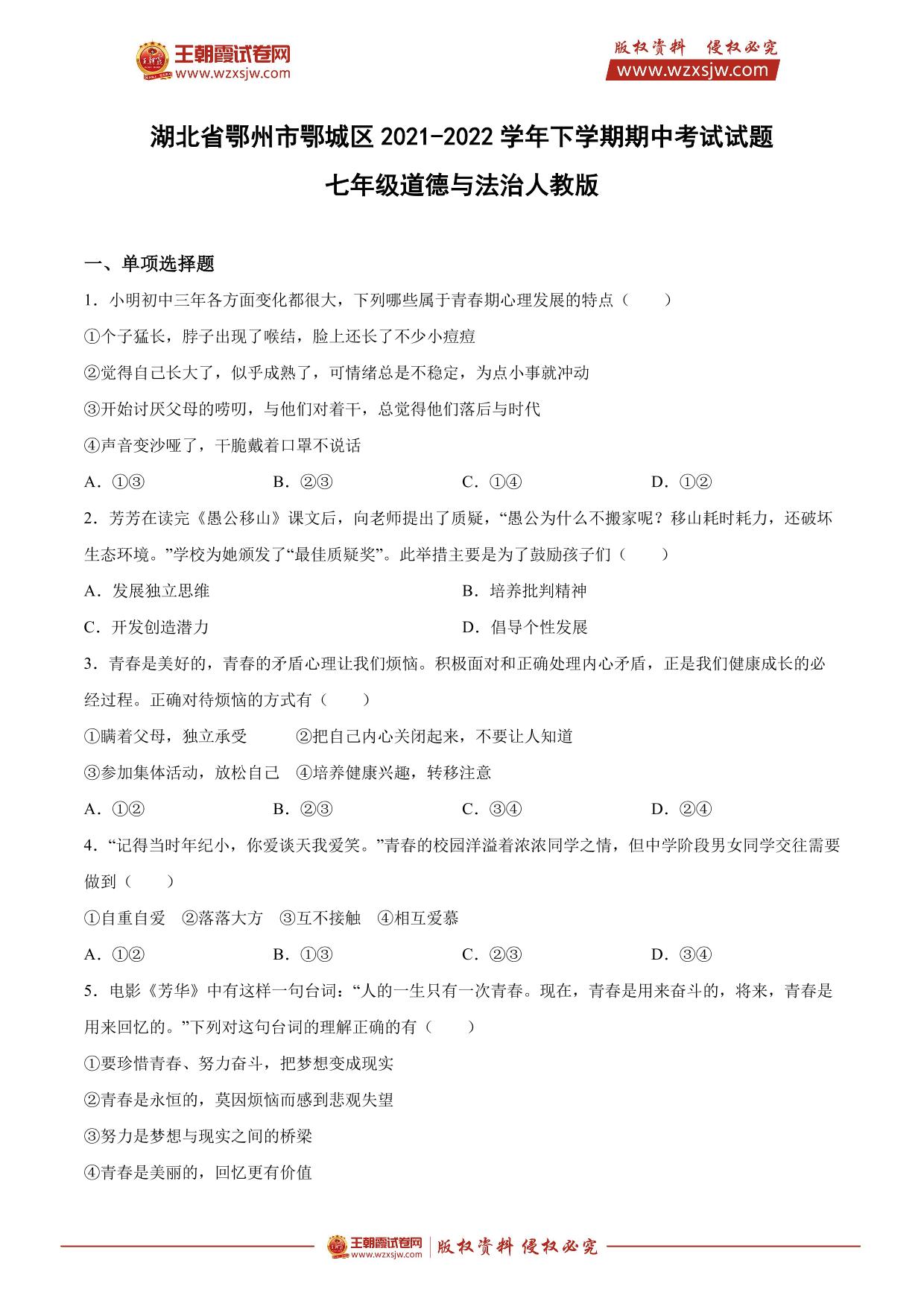 湖北省鄂州市鄂城区2021-2022学年下学期期中考试试题七年级道德与法治(人教版)