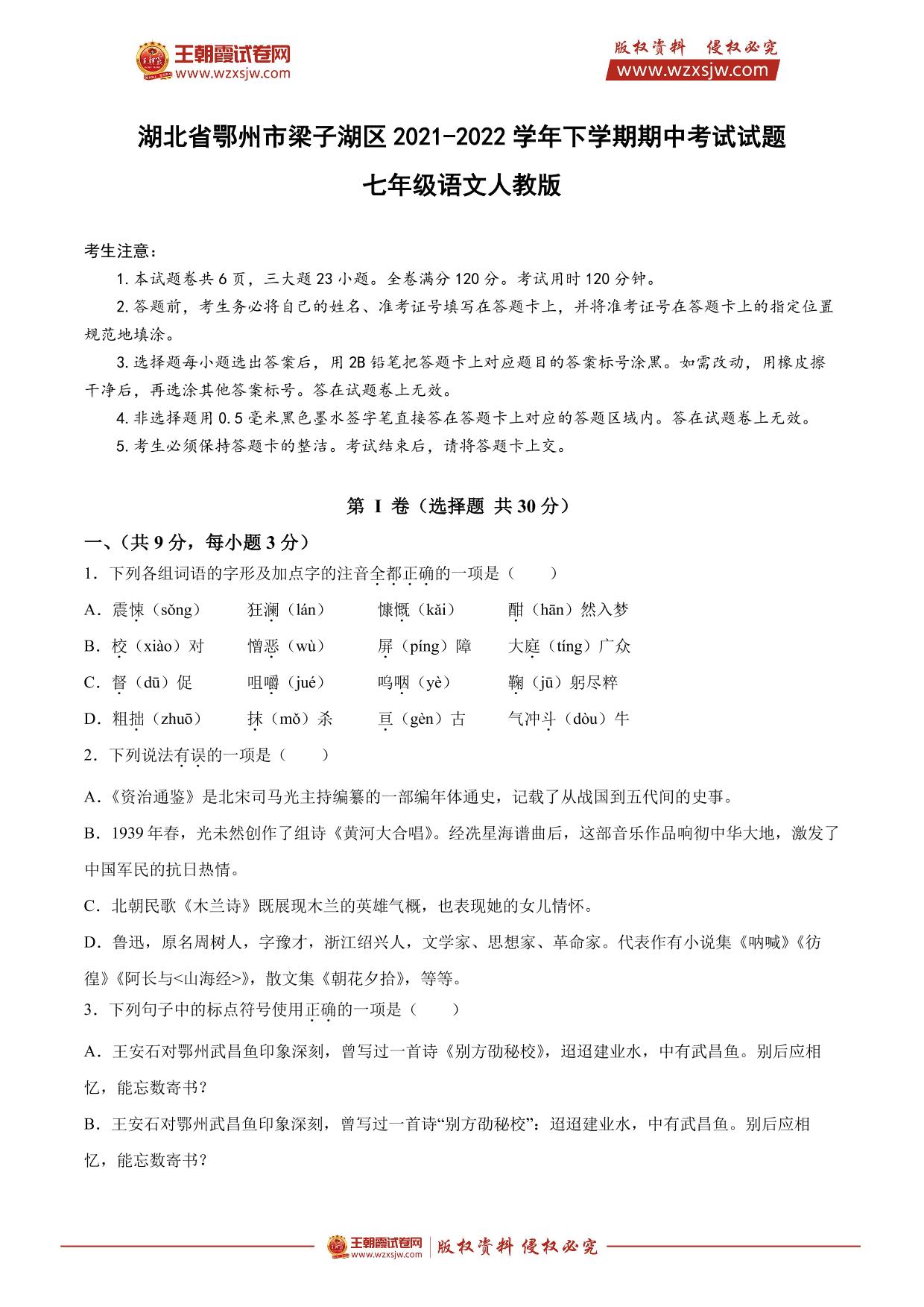 湖北省鄂州市梁子湖区2021-2022学年下学期期中考试试题七年级语文(人教版)