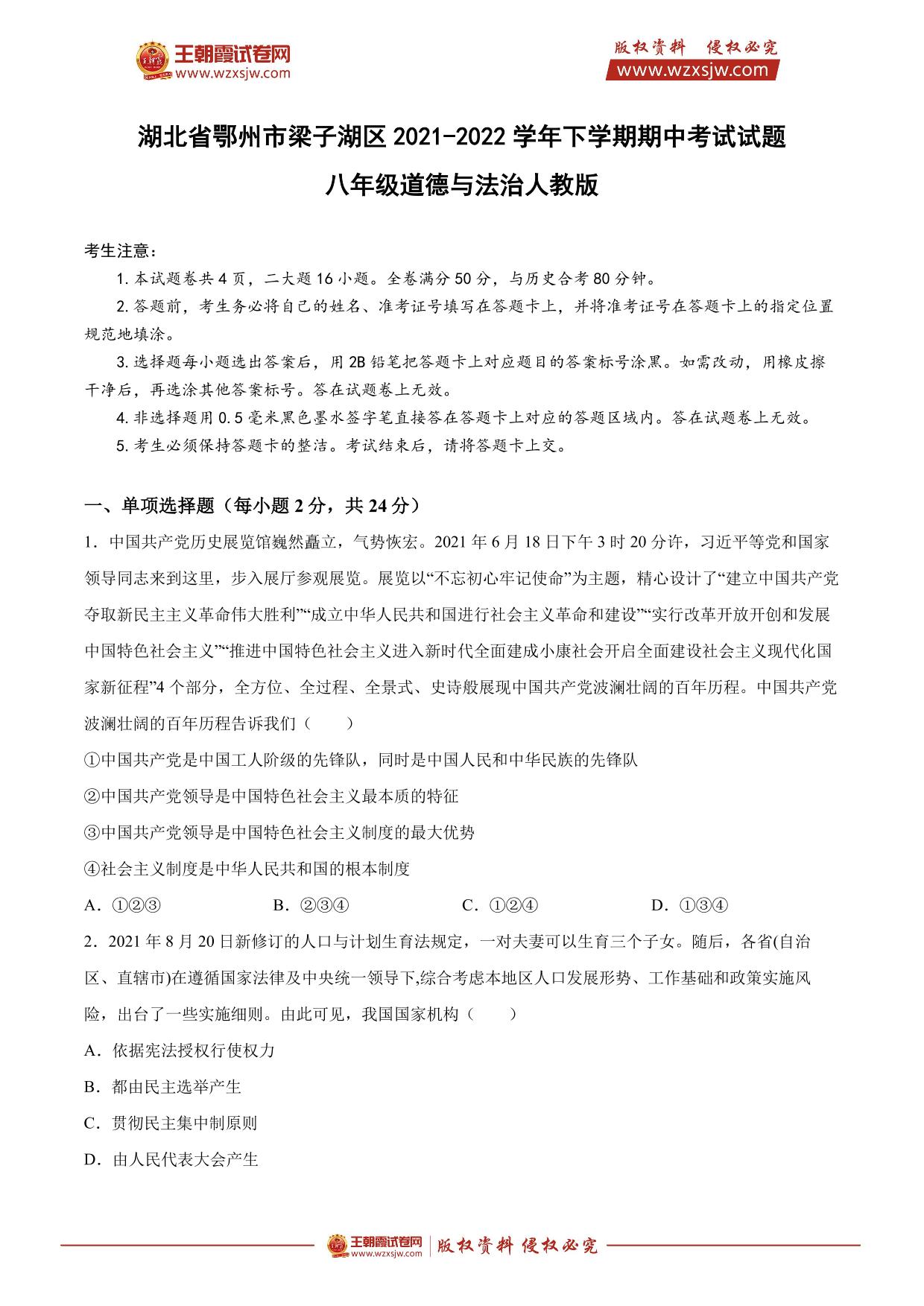 湖北省鄂州市梁子湖区2021-2022学年下学期期中考试试题八年级道德与法治(人教版)