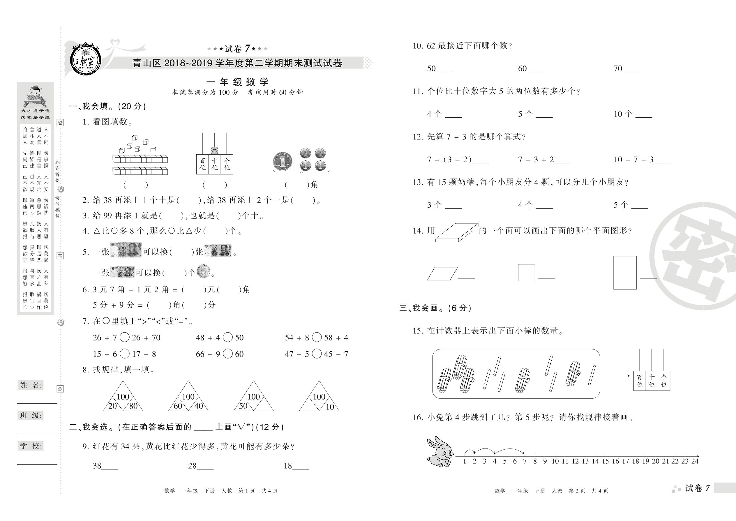2018-2019学年第二学期武汉市青山区一年级数学试卷(人教版)【7】