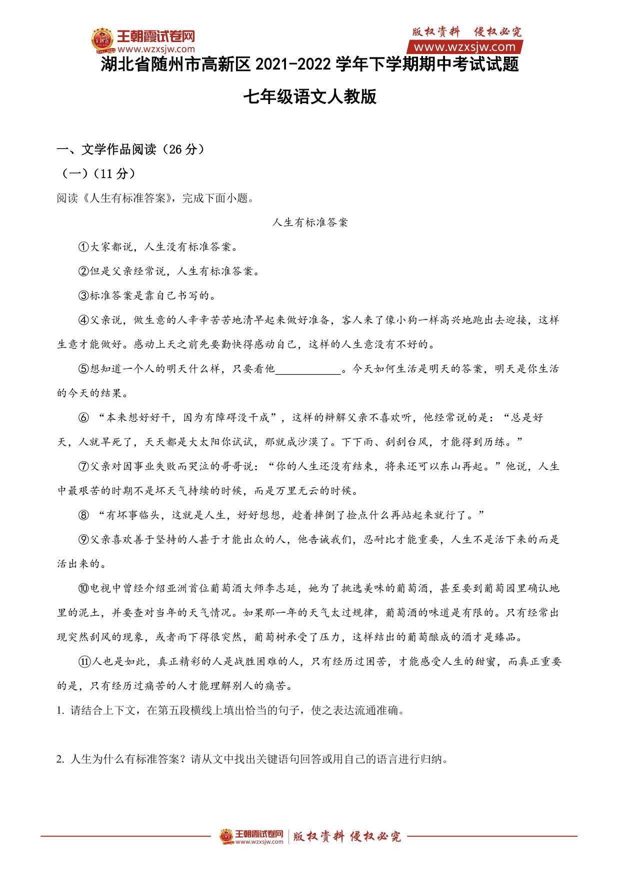 湖北省随州市高新区2021-2022学年下学期期中考试试题七年级语文(人教版)