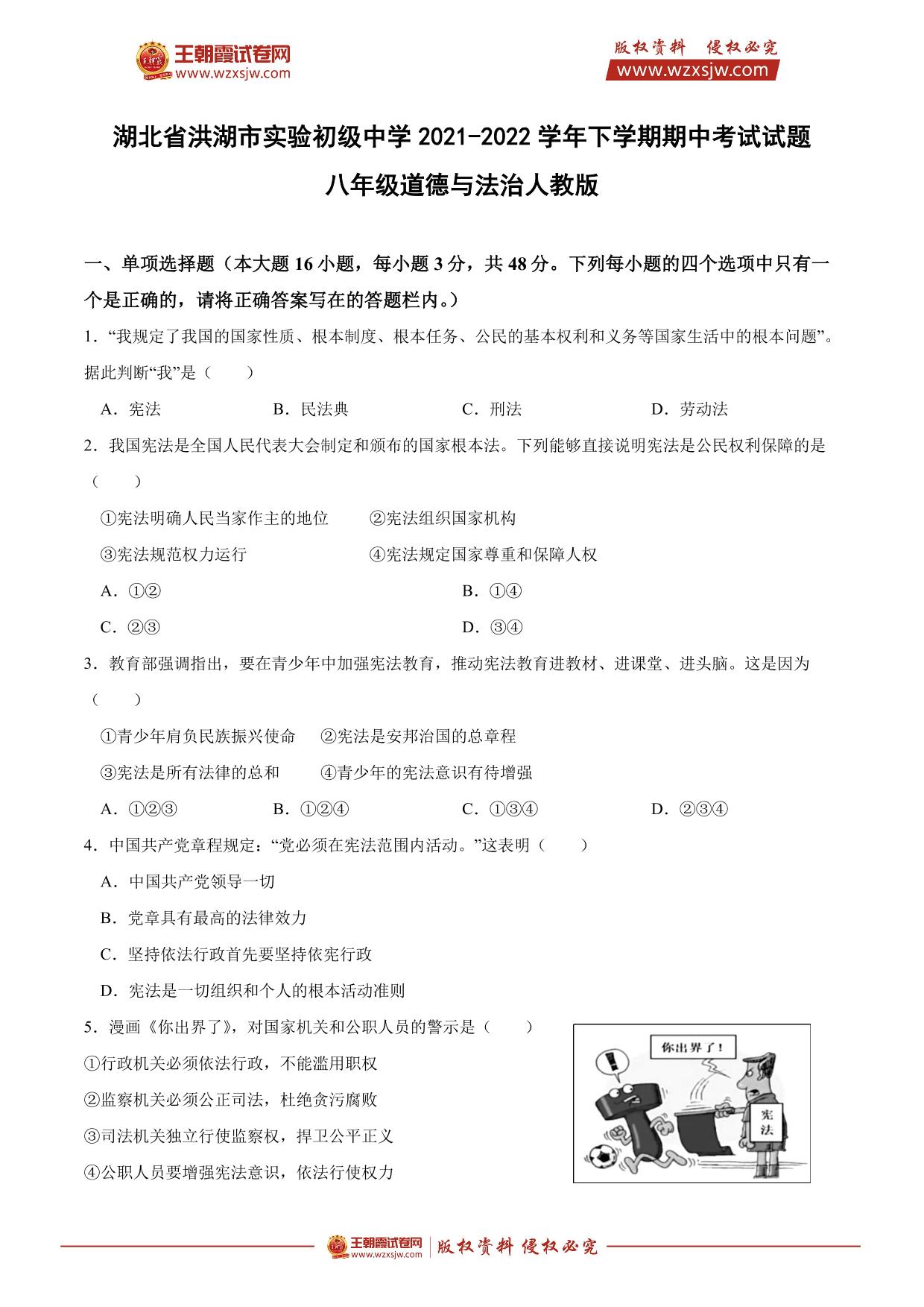 湖北省洪湖市实验初级中学2021-2022学年下学期期中考试试题八年级道德与法治(人教版)