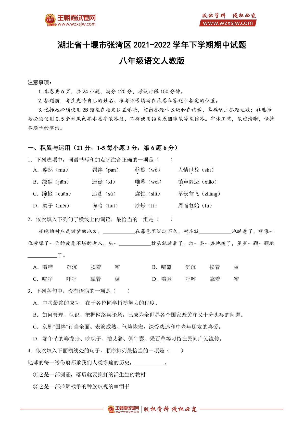 湖北省十堰市张湾区2021-2022学年下学期期中试题八年级语文(人教版)