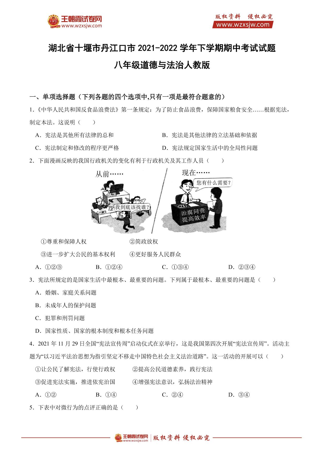 湖北省十堰市丹江口市2021-2022学年下学期期中考试试题八年级道德与法治(人教版)