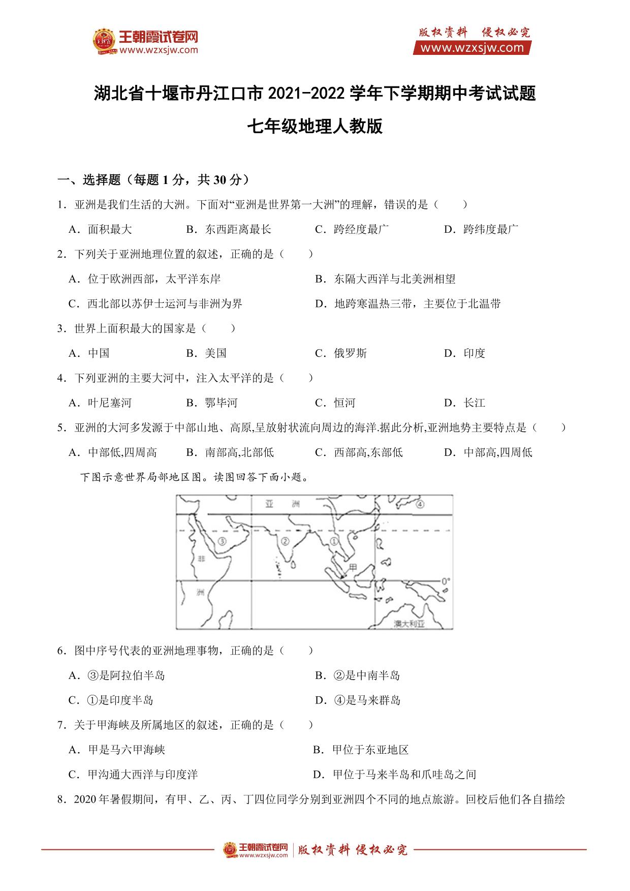 湖北省十堰市丹江口市2021-2022学年下学期期中考试试题七年级地理(人教版)