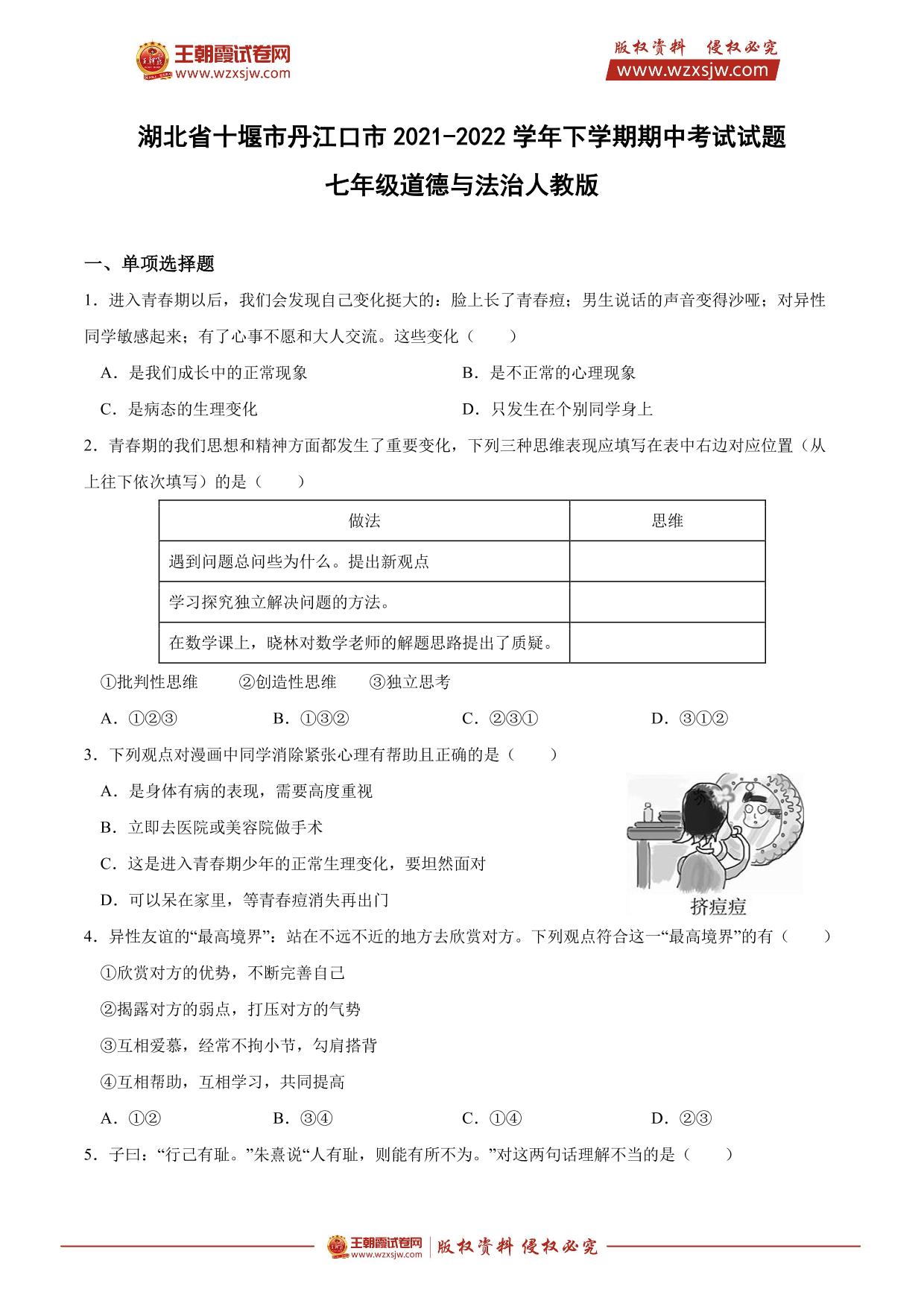 湖北省十堰市丹江口市2021-2022学年下学期期中考试试题七年级道德与法治(人教版)