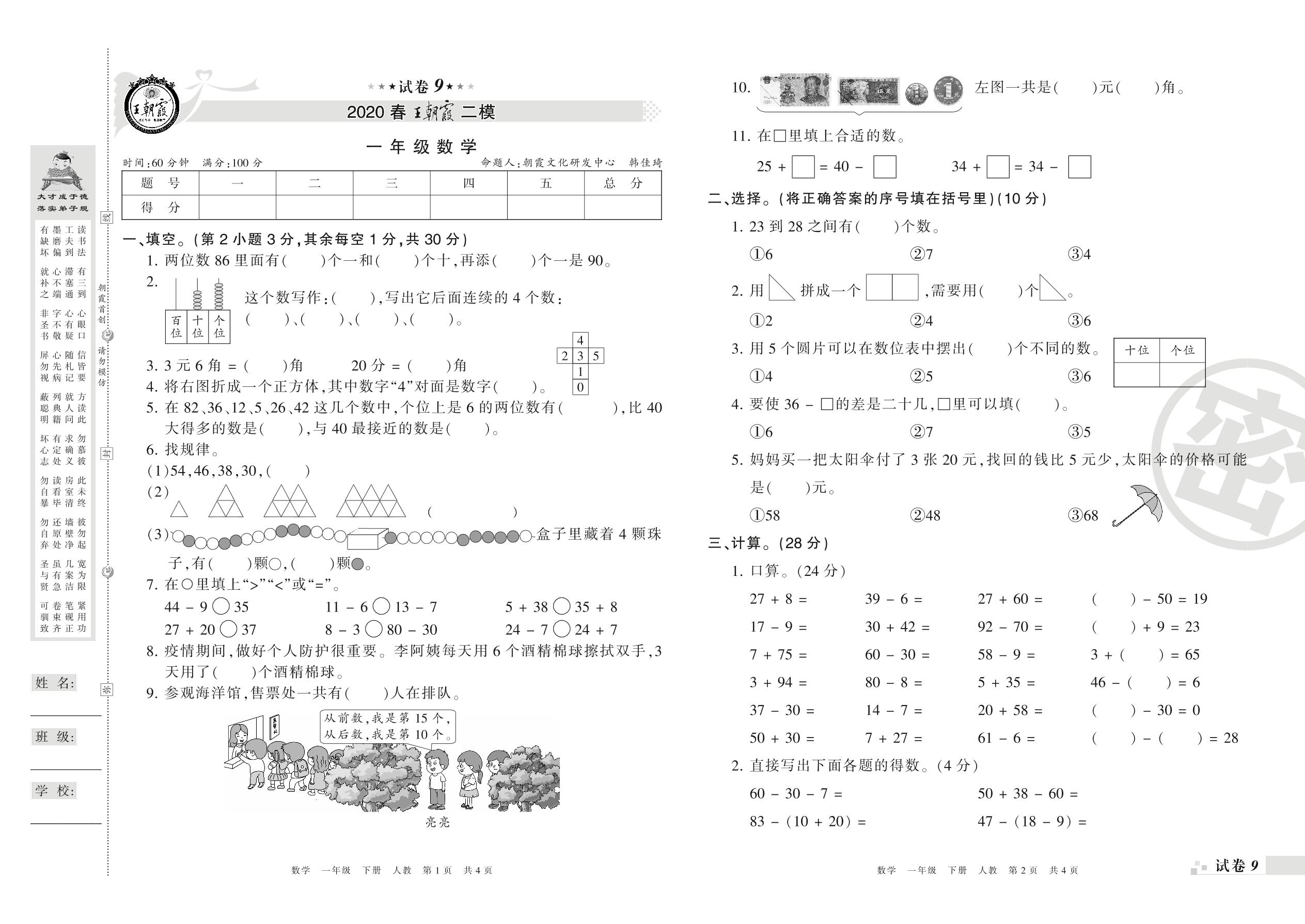 王朝霞期末模拟卷一年级下册数学(人教版)_R210802213309【9】
