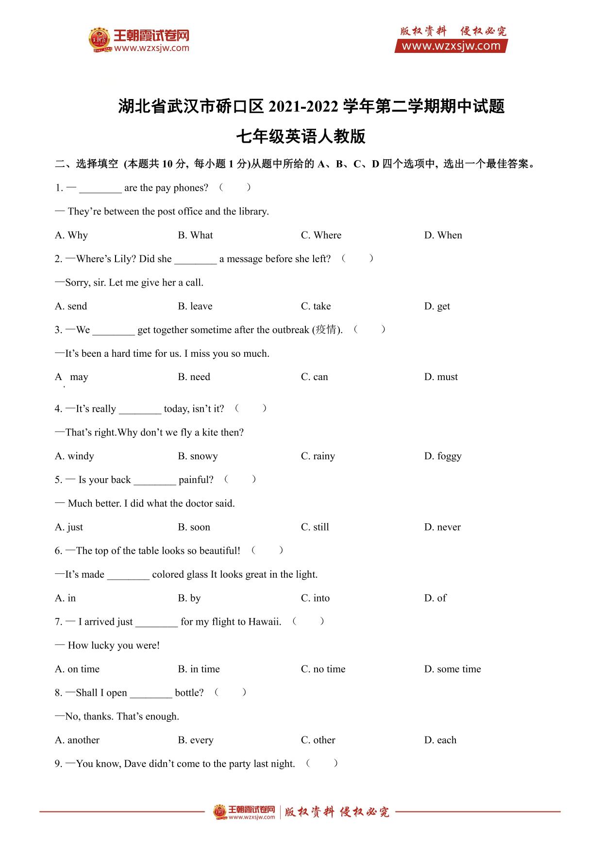 湖北省武汉市硚口区2021-2022学年第二学期期中试题七年级英语(人教版)【无听力音频】
