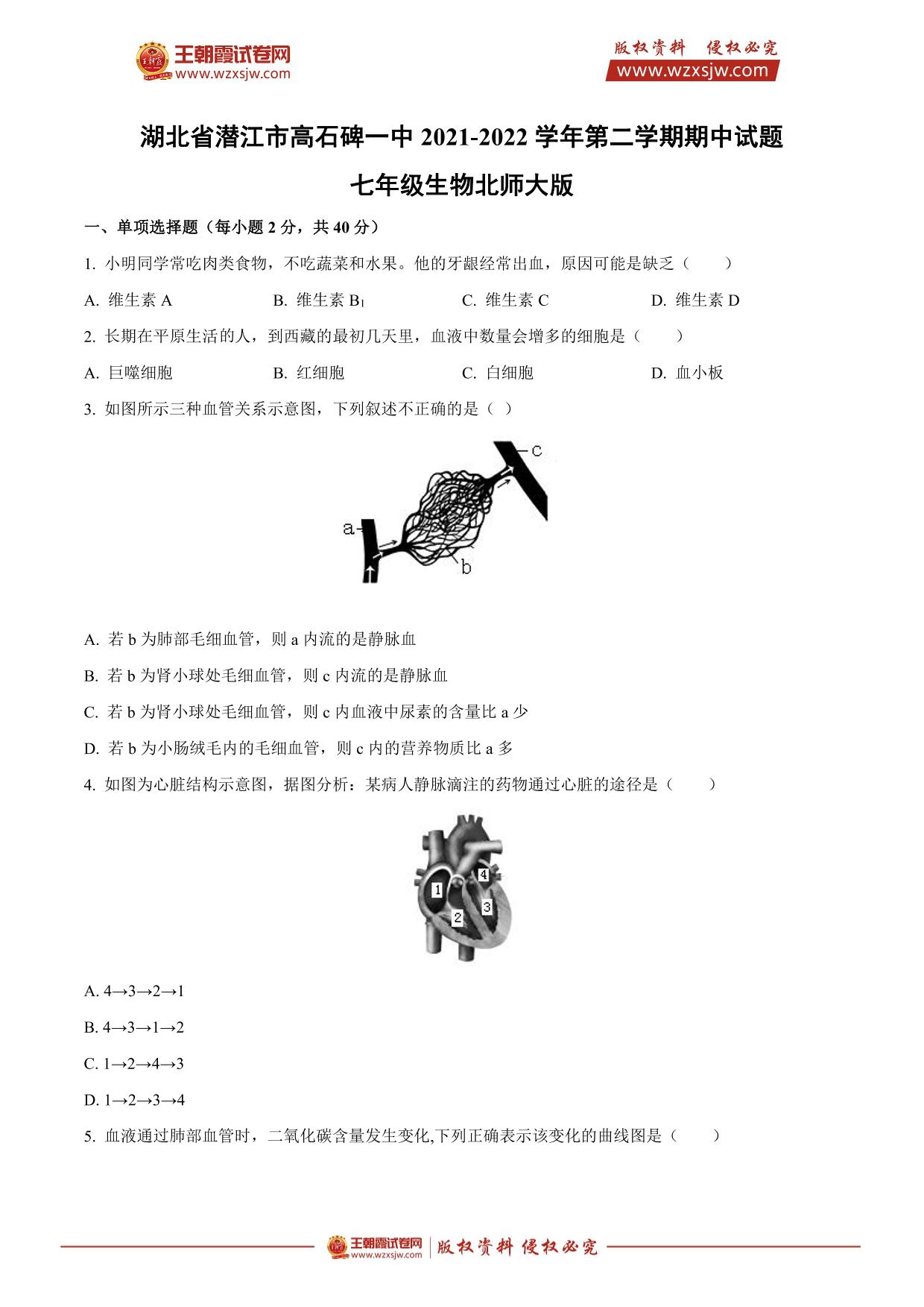 湖北省潜江市高石碑一中2021-2022学年第二学期期中试题七年级生物(北师大版)