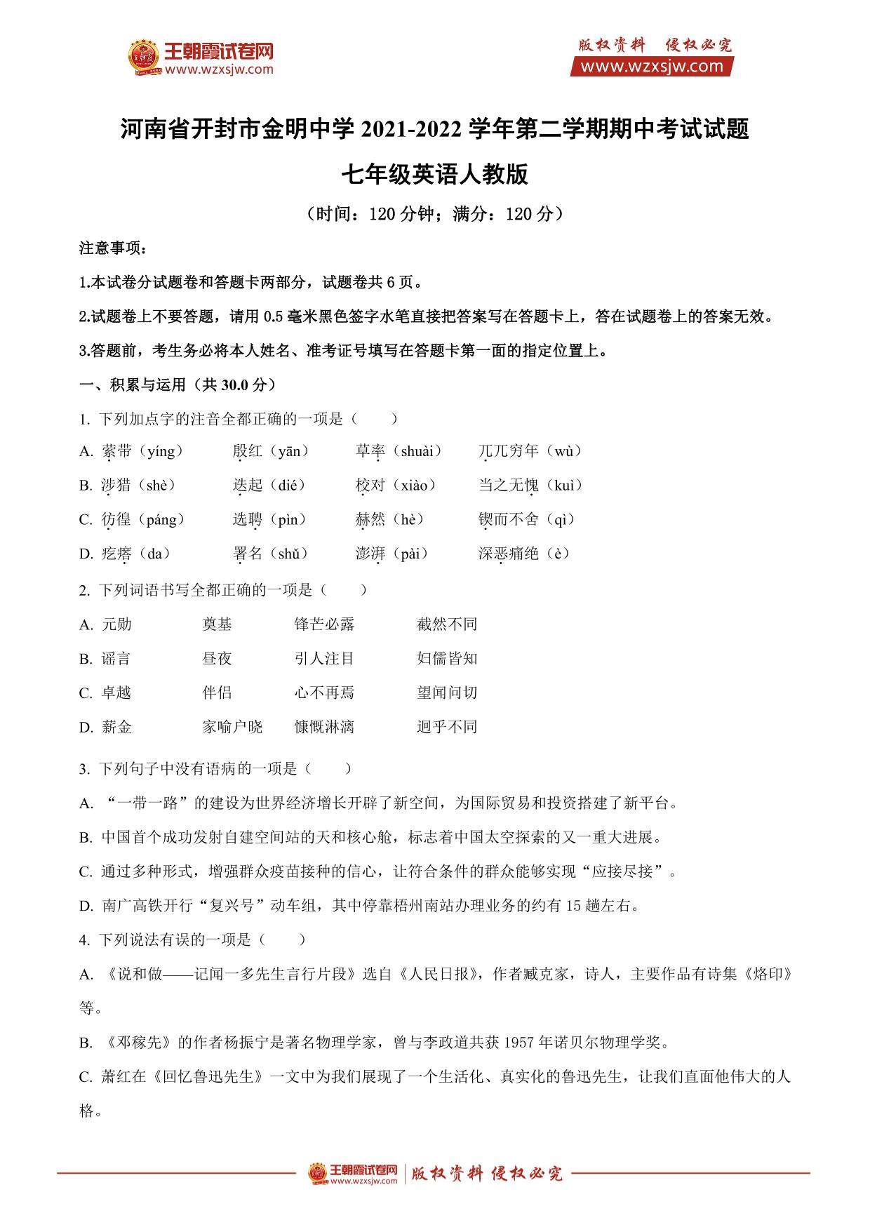 河南省洛阳市老城区2021-2022学年第二学期期中试题七年级语文(人教版)