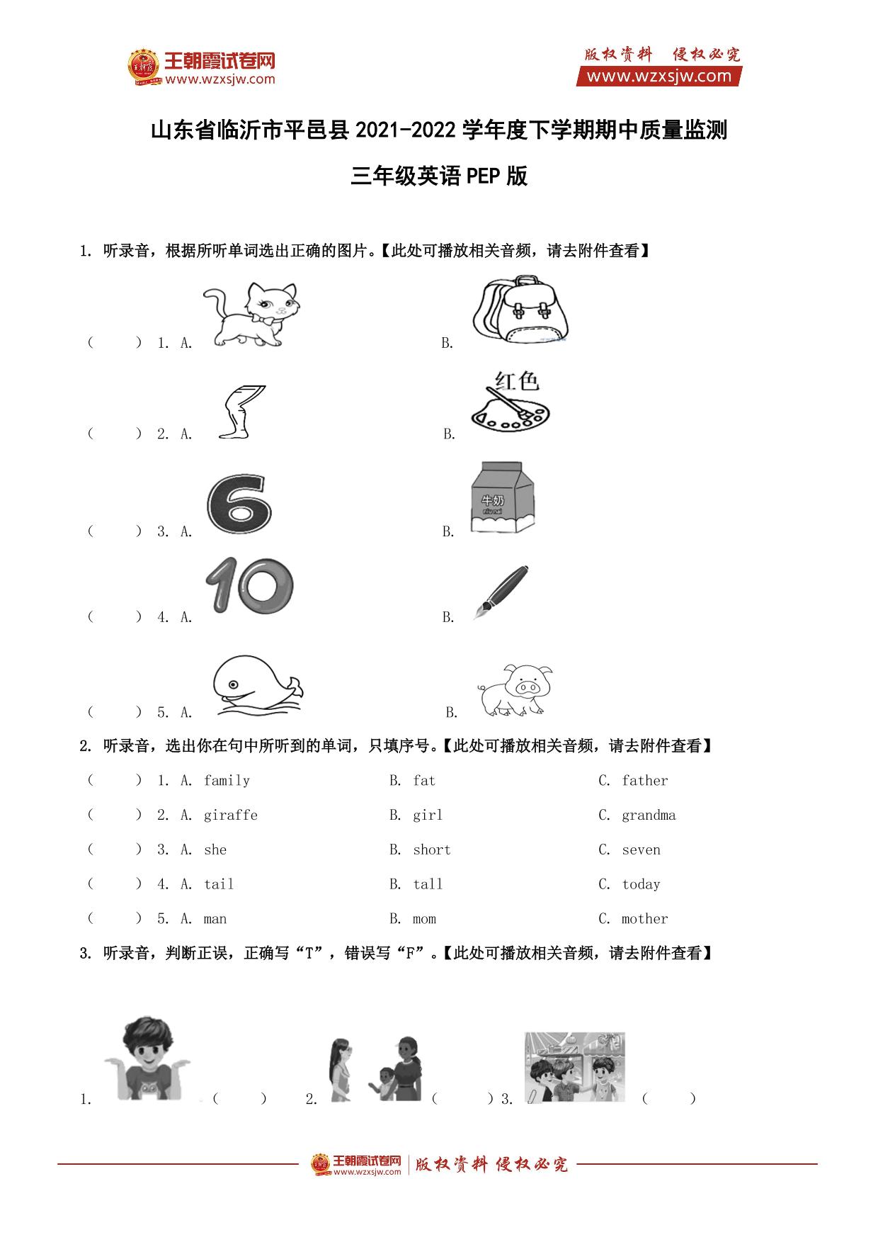 山东省临沂市平邑县2021-2022学年度下学期期中质量监测三年级英语(PEP版)【无听力音频】