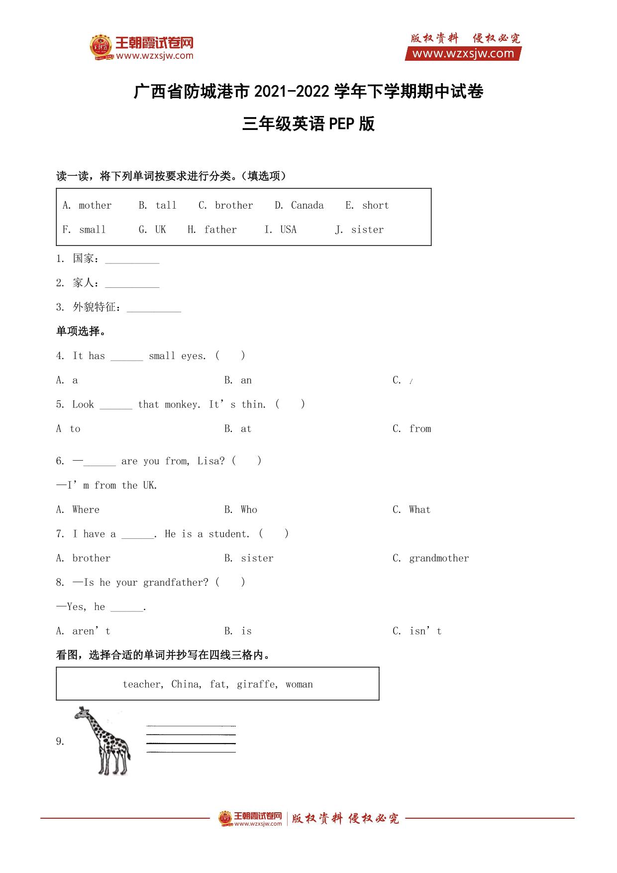 广西防城港市2021-2022学年下学期期中试卷三年级英语(PEP版)【无听力音频】