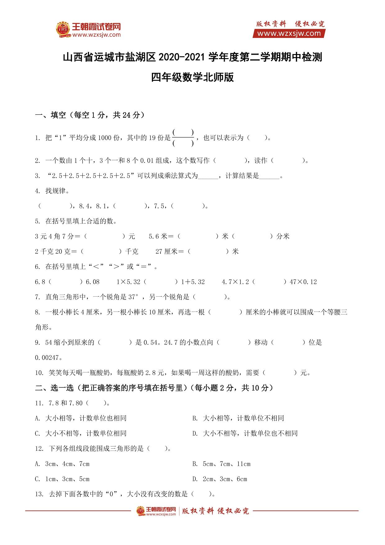 山西省运城市盐湖区2020-2021学年度第二学期期中检测四年级数学(北师版)