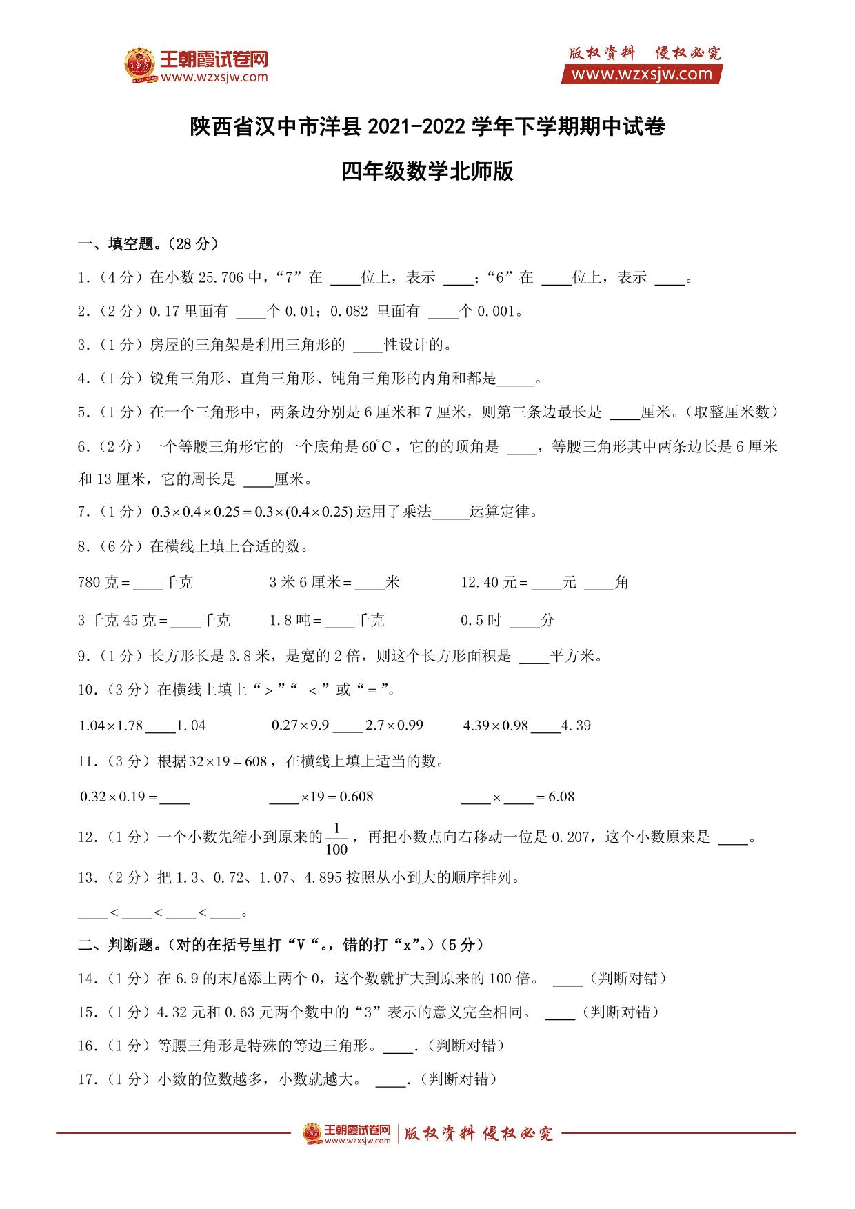 陕西省汉中市洋县2021-2022学年下学期期中试卷四年级数学(北师版)