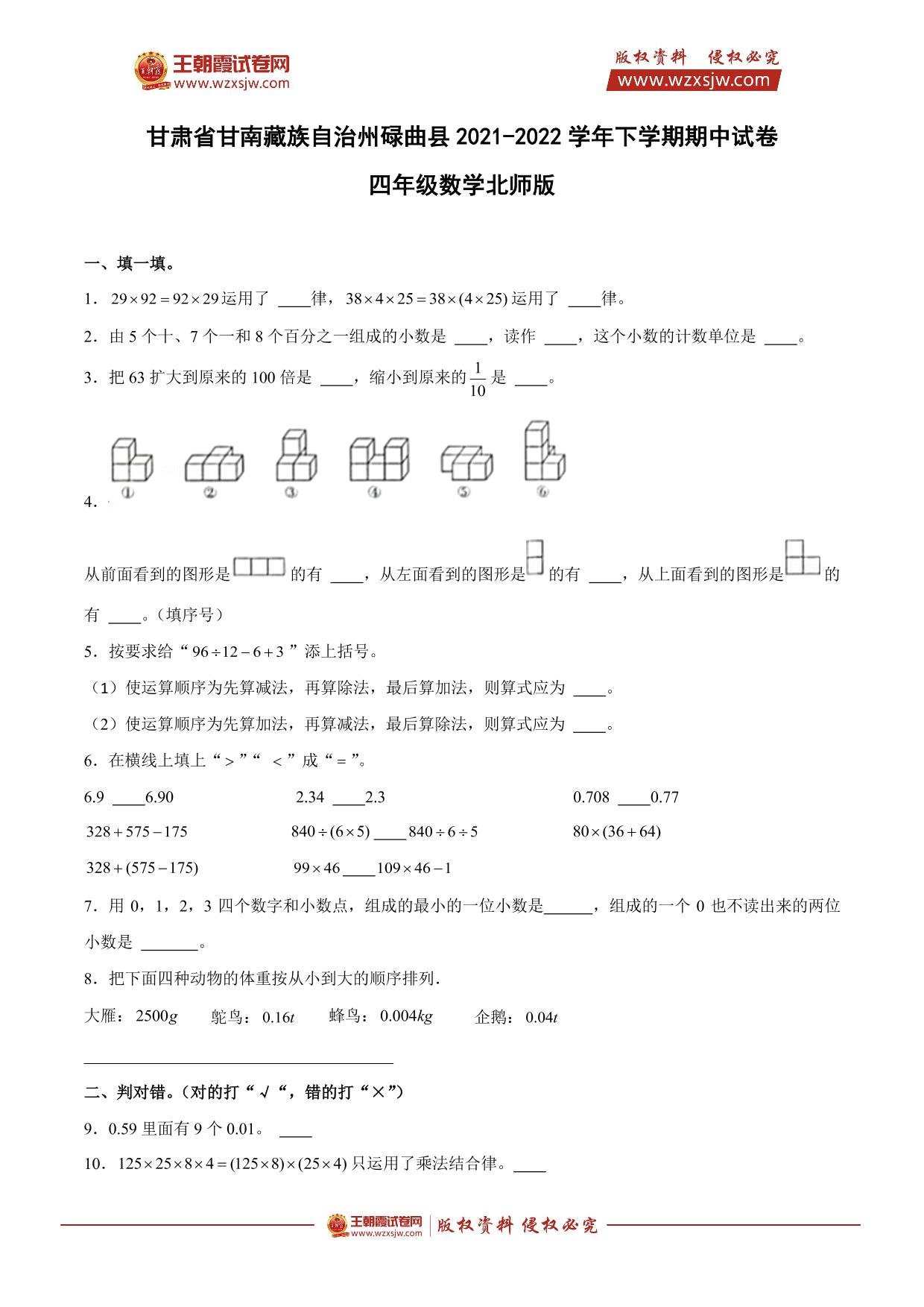 甘肃省甘南藏族自治州碌曲县2021-2022学年下学期期中试题四年级数学(北师版)