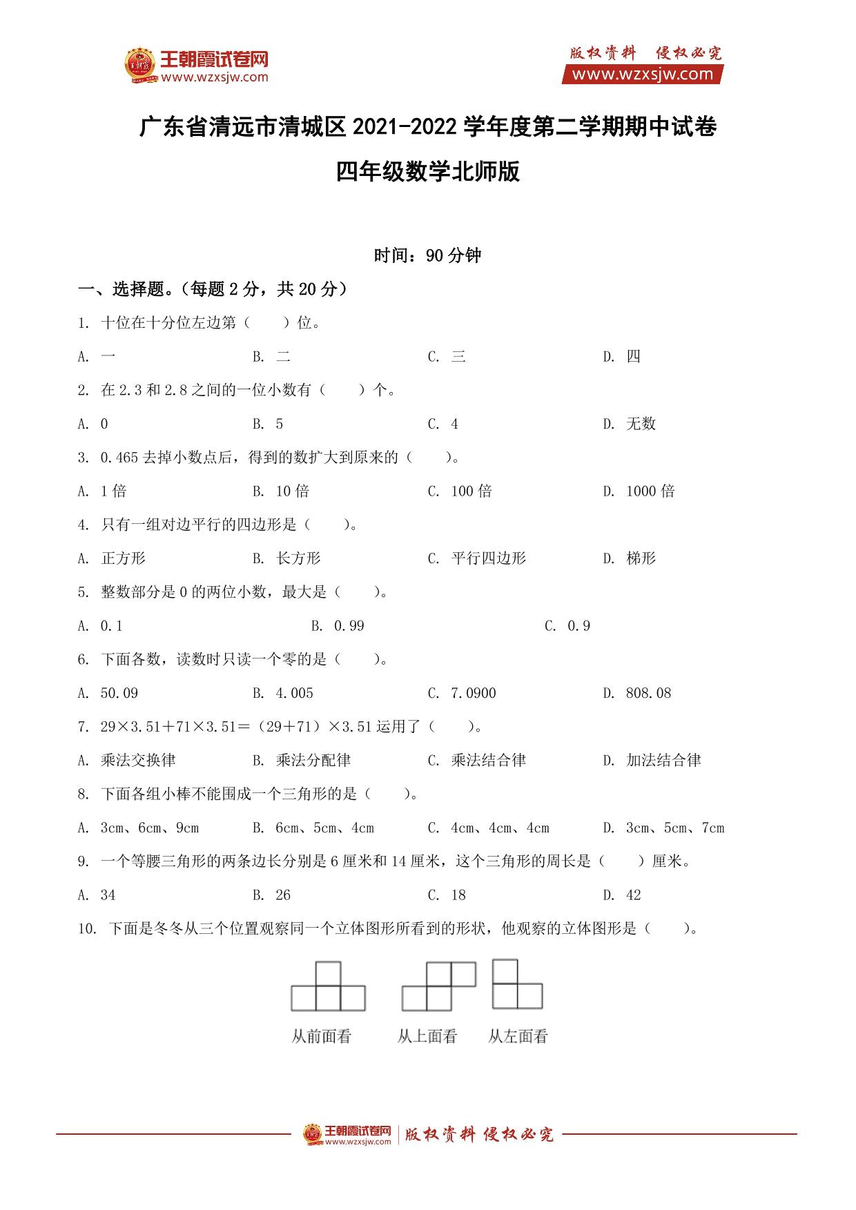 广东省清远市清城区2021-2022学年度第二学期期中试卷四年级数学(北师版)