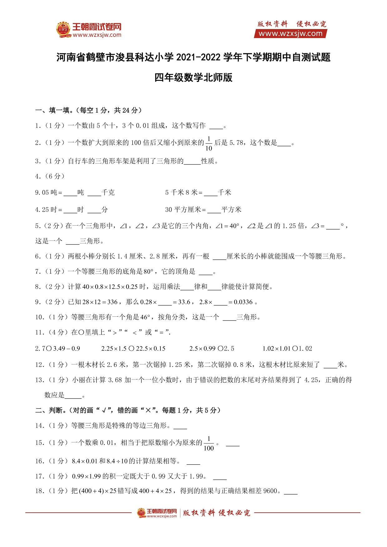 河南省鹤壁市浚县科达小学2021-2022学年下学期期中自测题四年级数学(北师版)