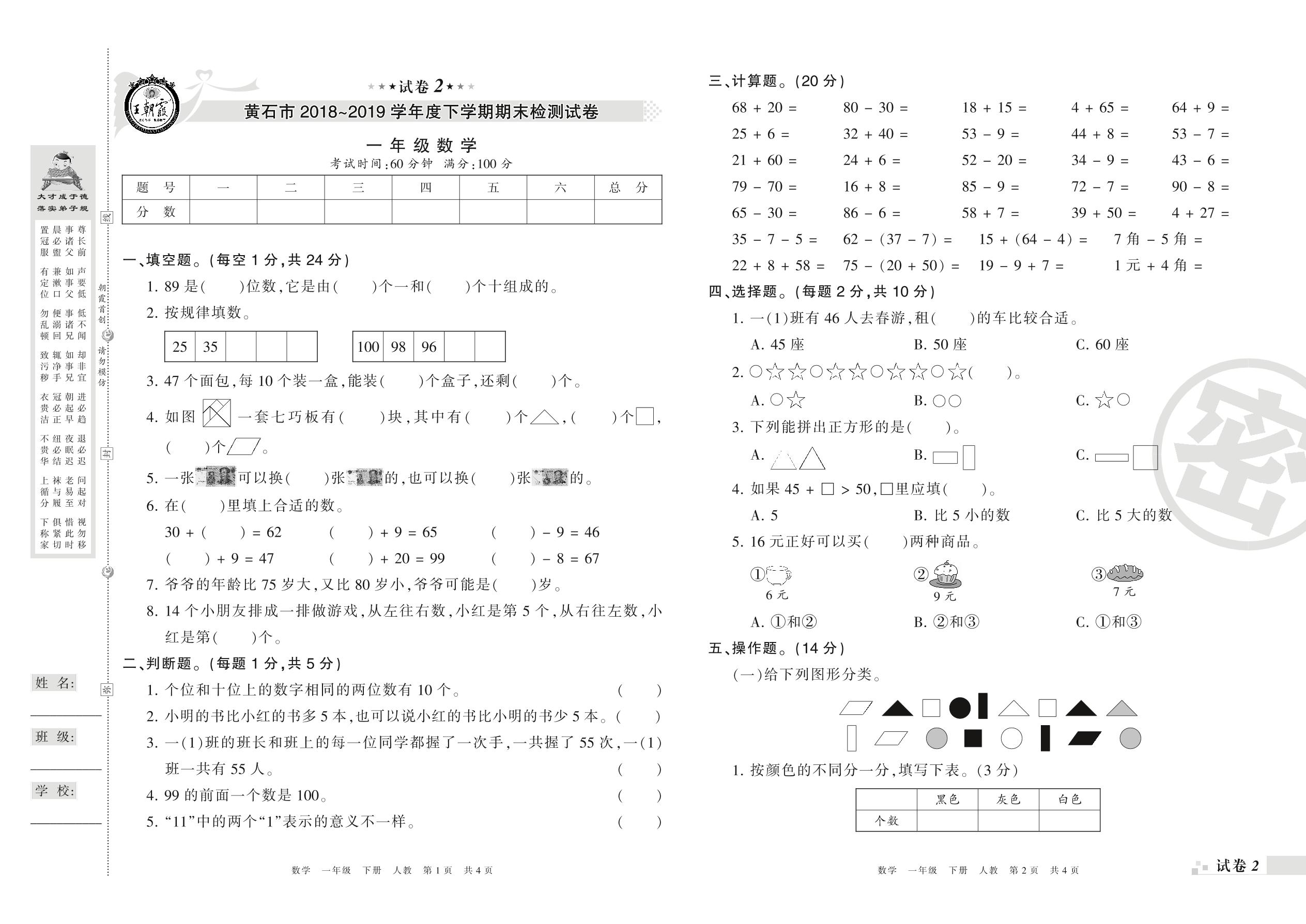 2018-2019学年第二学期黄石市一年级数学试卷(人教版)【2】