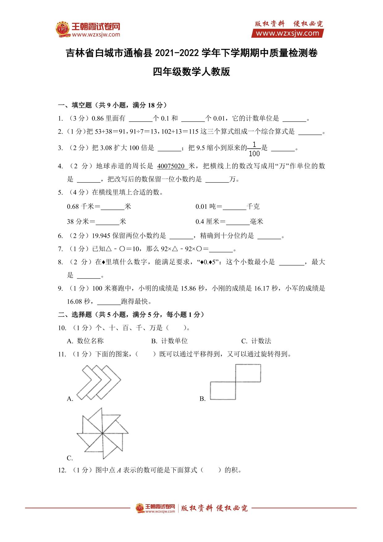 吉林省白城市通榆县2021-2022学年下学期期中质量检测卷四年级数学(人教版)