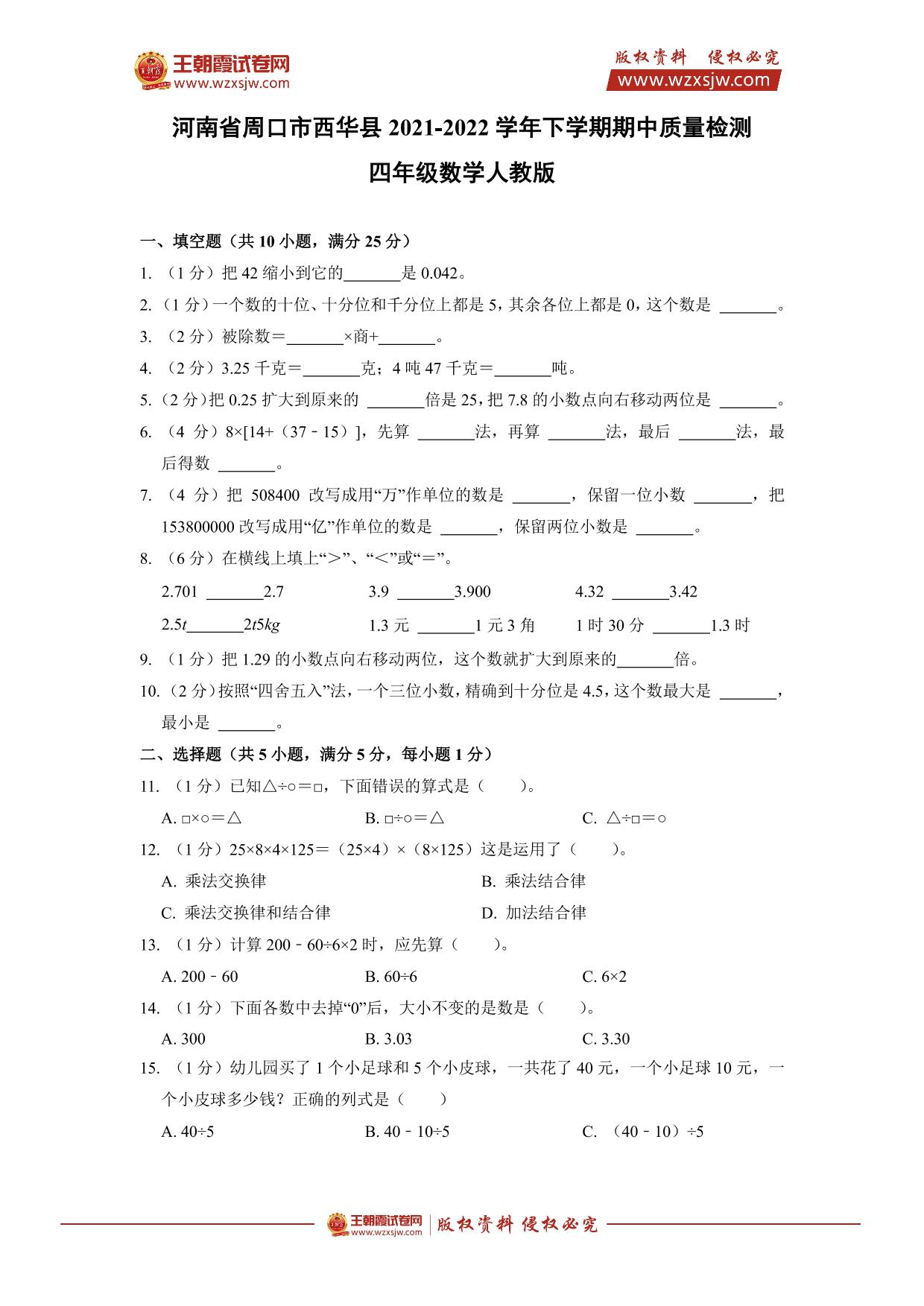 河南省周口市西华县2021-2022学年下学期期中质量检测四年级数学(人教版)