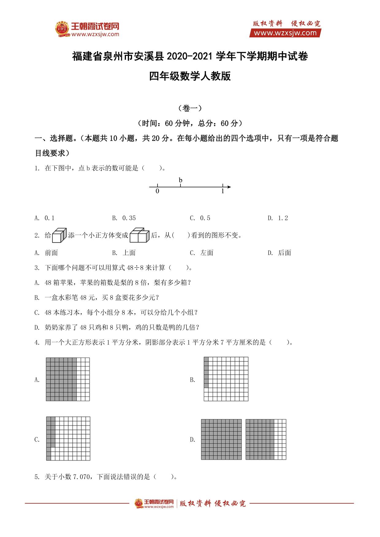 福建省泉州市安溪县2020-2021学年下学期期中试卷四年级数学(人教版)