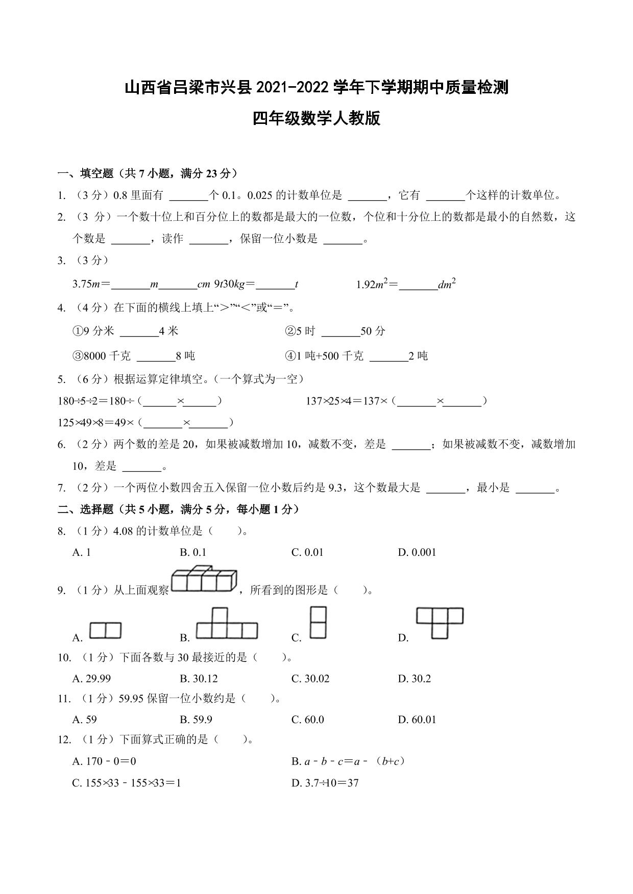 山西省吕梁市兴县2021-2022学年下学期期中质量检测试题四年级数学(人教版)