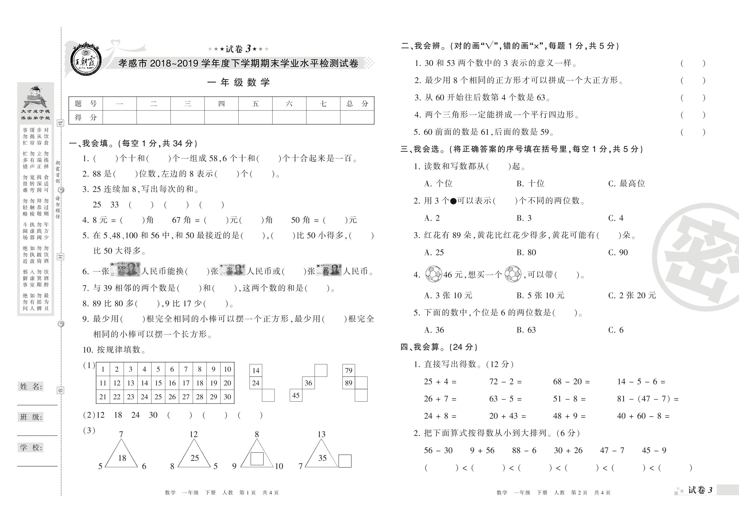 2018-2019学年第二学期孝感市一年级数学试卷(人教版)【3】