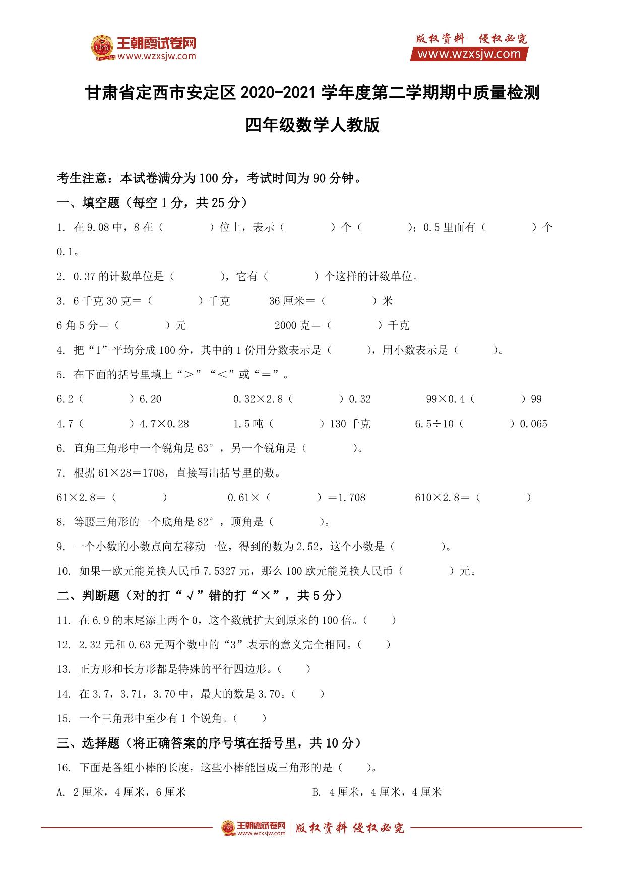 甘肃省定西市安定区2020-2021学年度第二学期期中质量检测四年级数学(人教版)