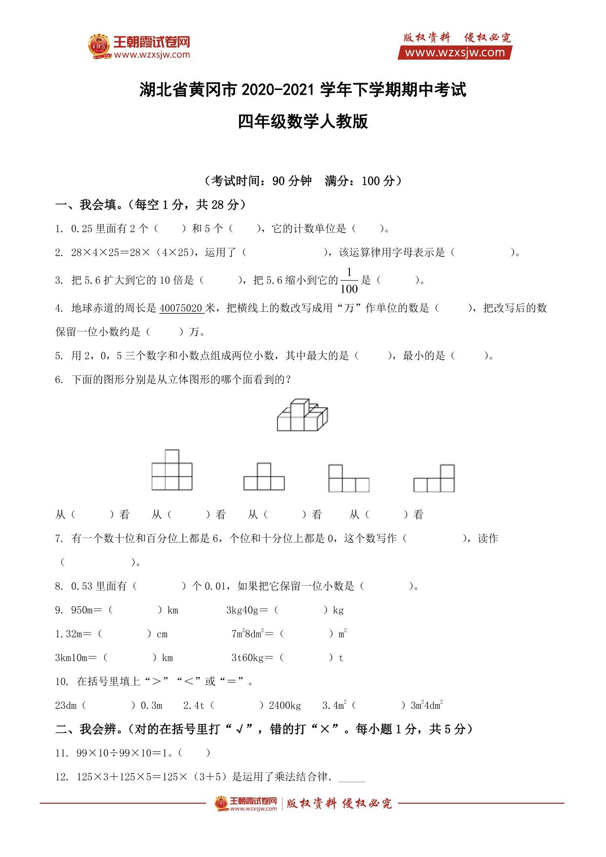 湖北省黄冈市2020-2021学年下学期期中考试四年级数学(人教版)