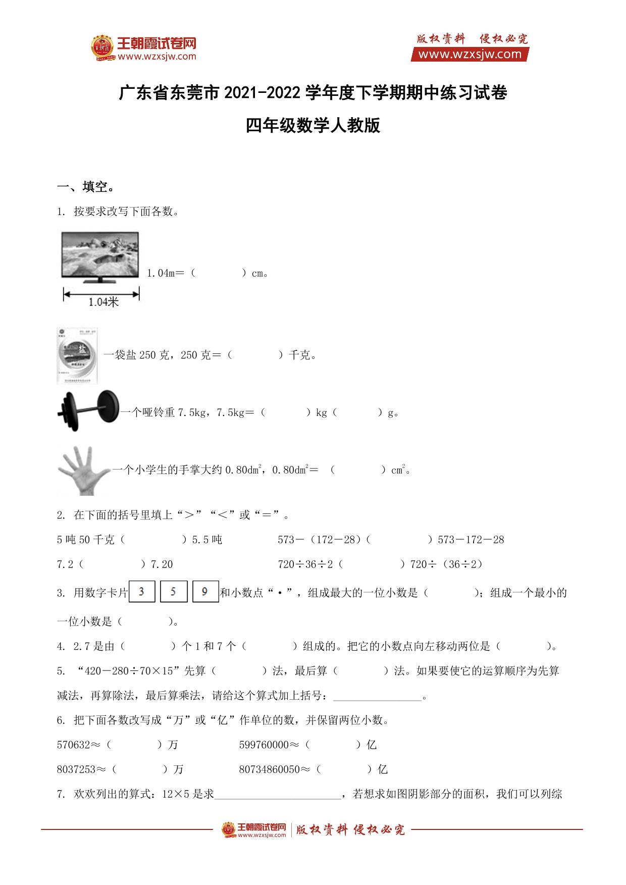 广东省东莞市2020-2021学年度下学期期中练习试卷四年级数学(人教版)