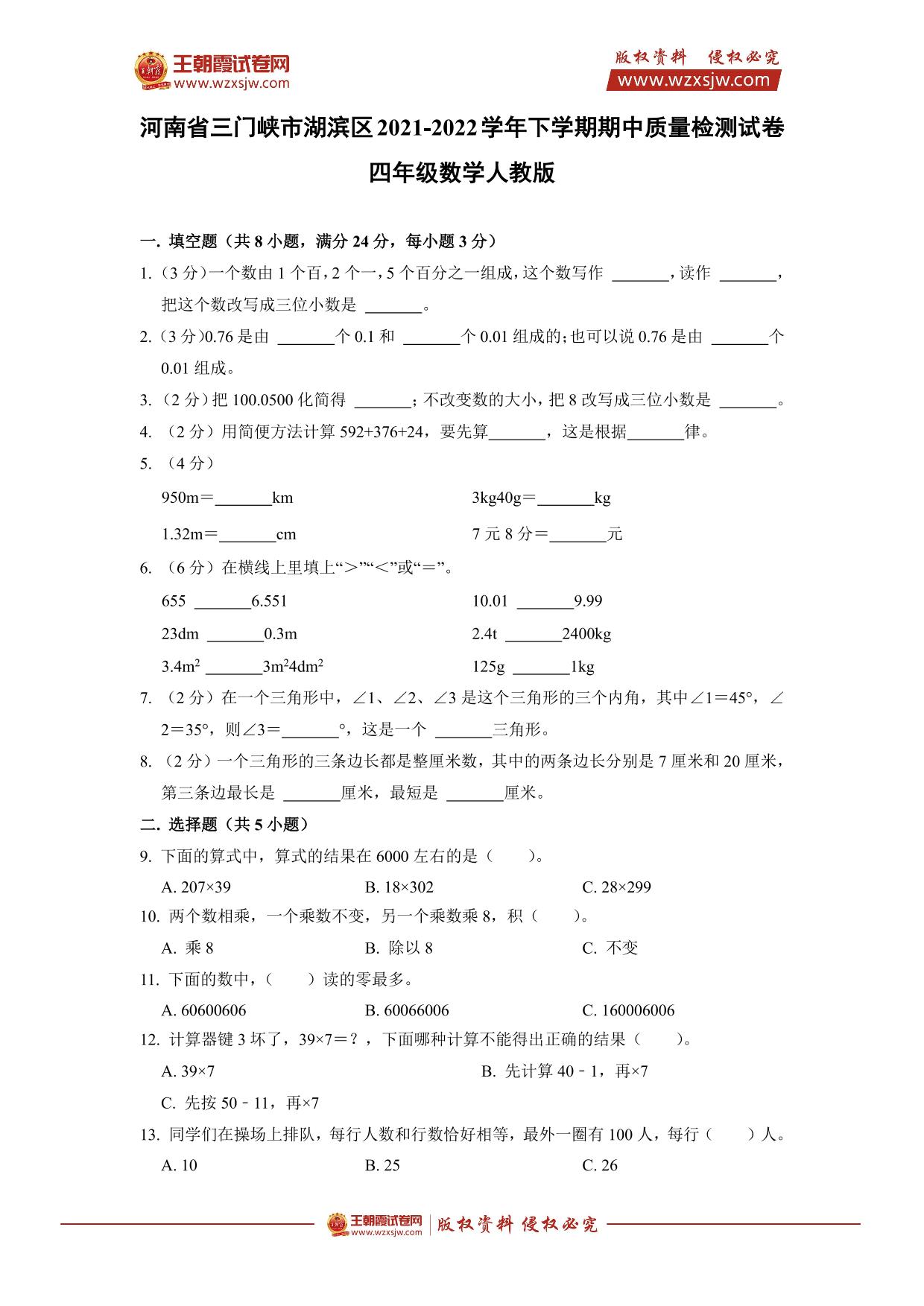 河南省三门峡市湖滨区2021-2022学年下学期期中质量检测试卷四年级数学(人教版)
