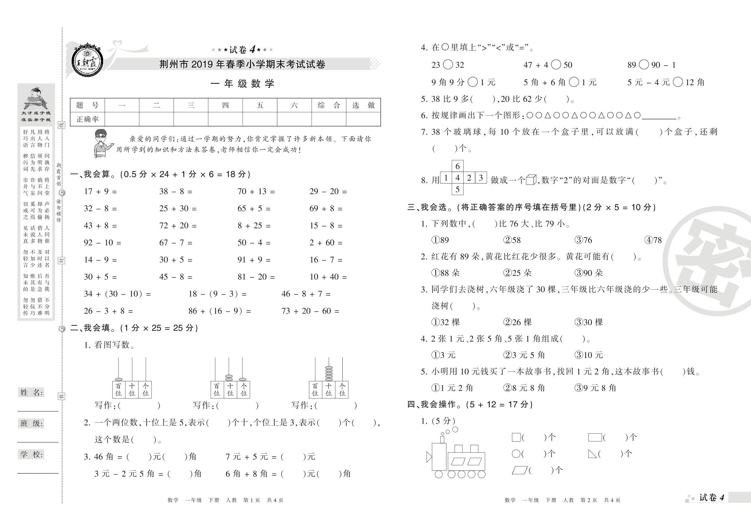 2018-2019学年第二学期荆州市一年级数学试卷(人教版)【4】