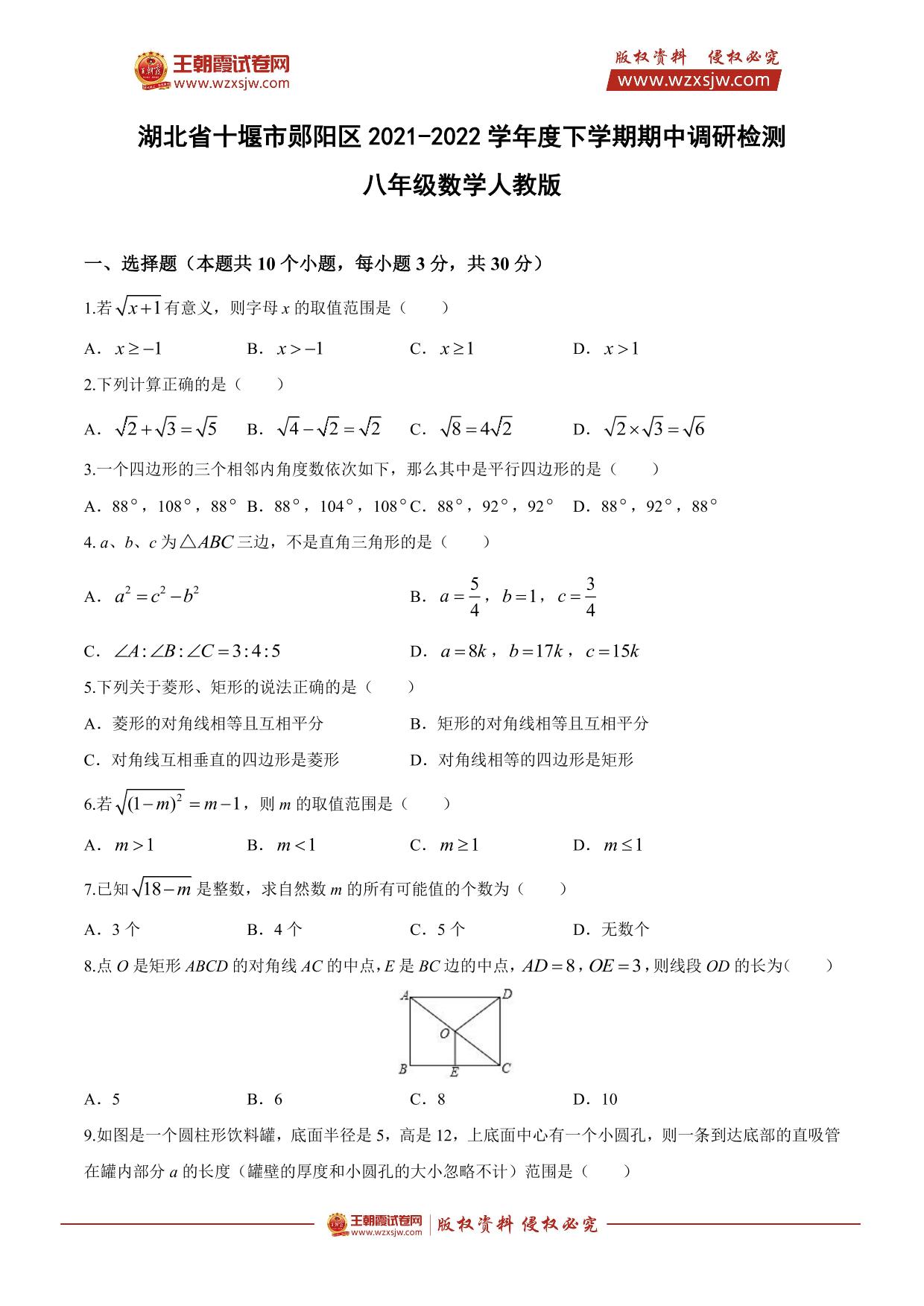 湖北省十堰市郧阳区2021-2022学年度下学期期中调研检测八年级数学(人教版)