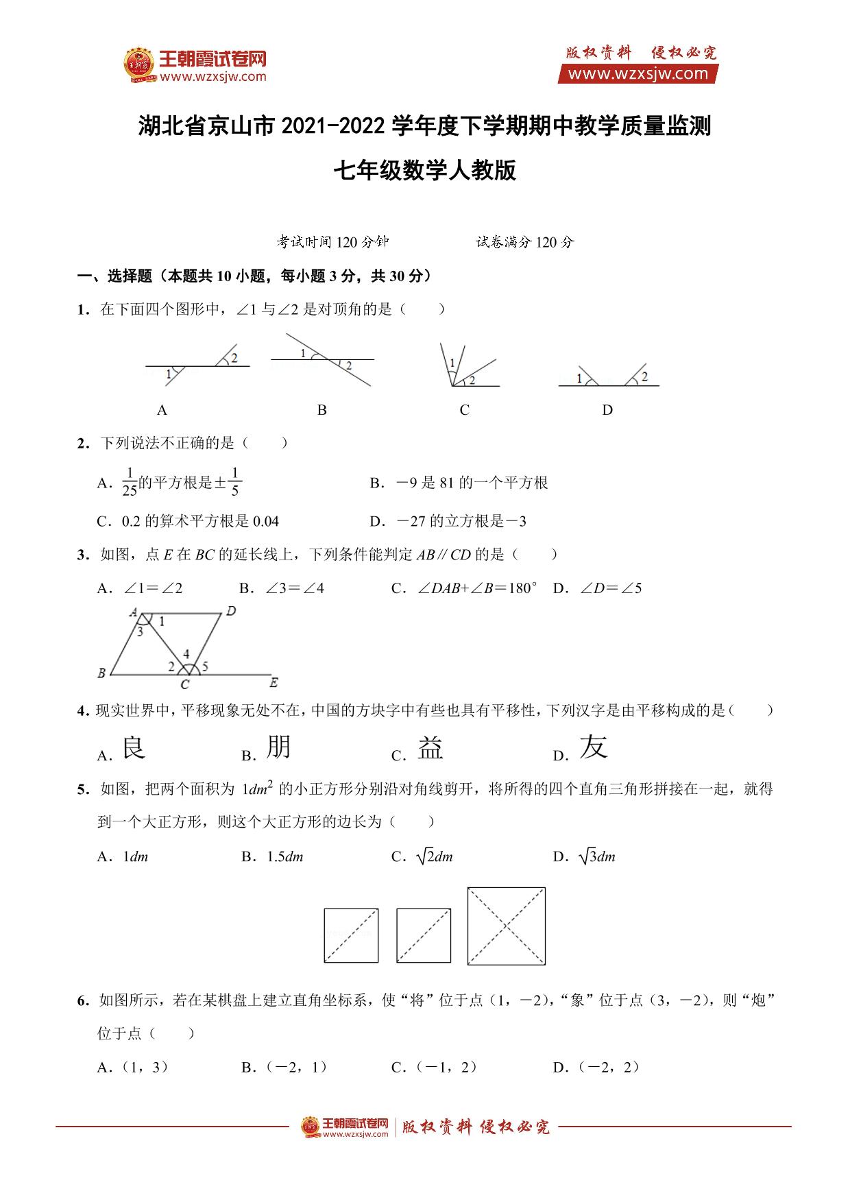 湖北省京山市2021-2022学年下学期期中教学质量监测七年级数学(人教版)
