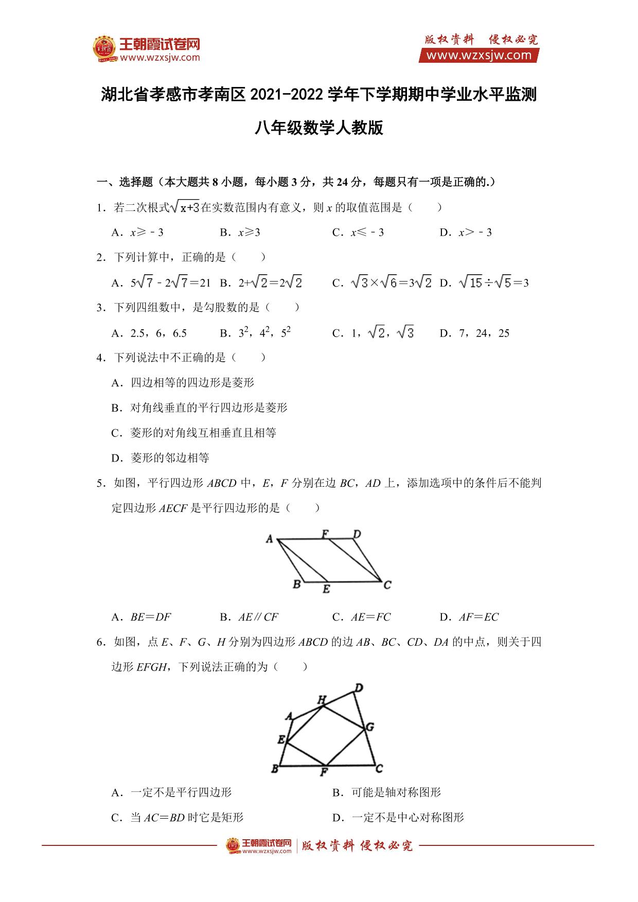 湖北省孝感市孝南区2021-2022学年下学期期中学业水平监测八年级数学(人教版)