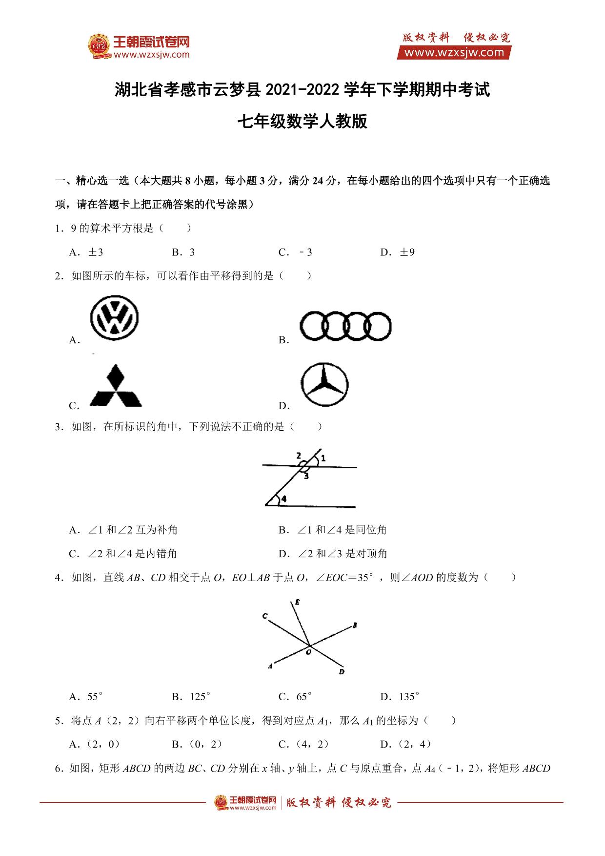 湖北省孝感市云梦县2021-2022学年下学期期中考试七年级数学(人教版)