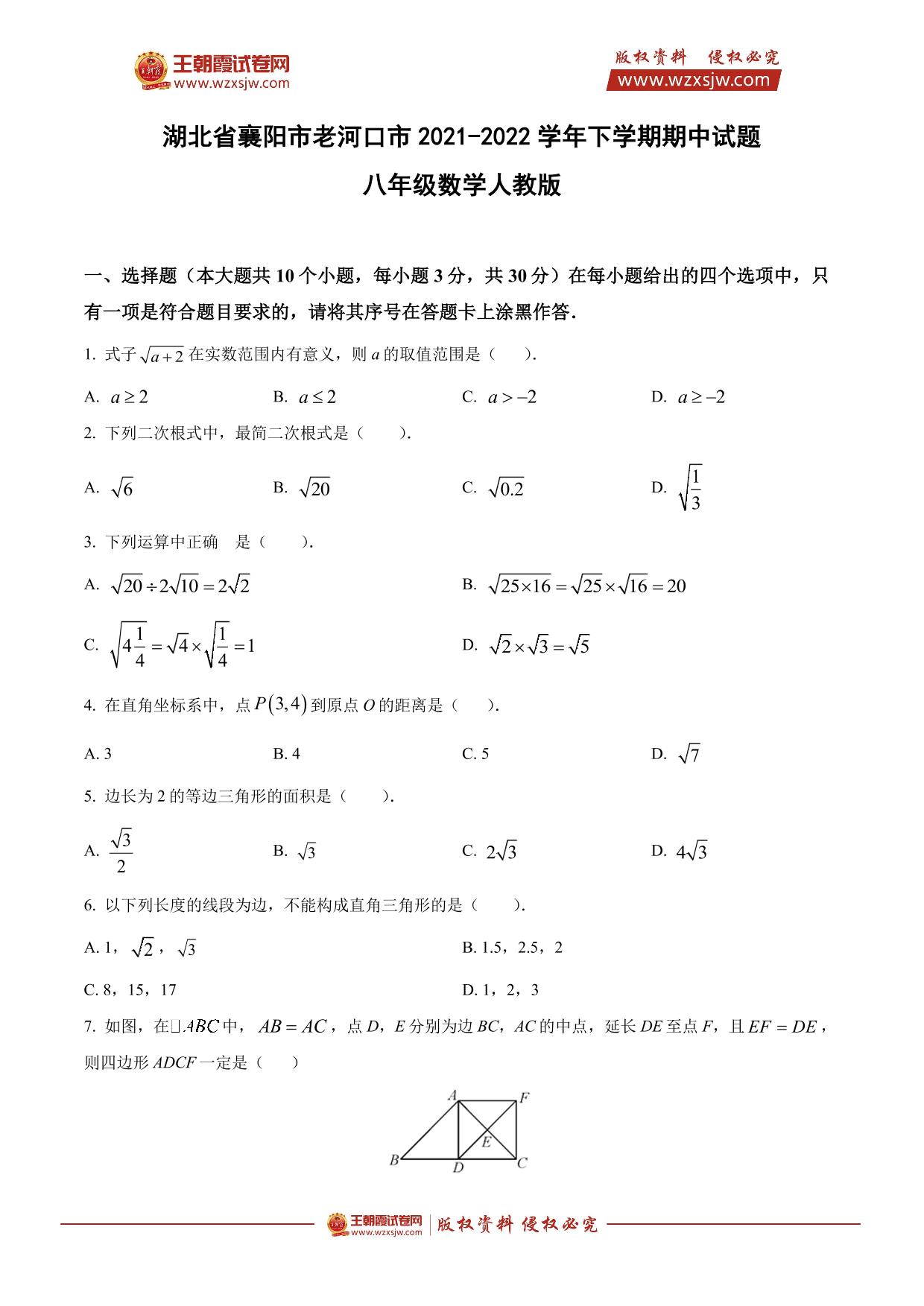 湖北省襄阳市老河口市2021-2022学年下学期期中试题八年级数学(人教版)