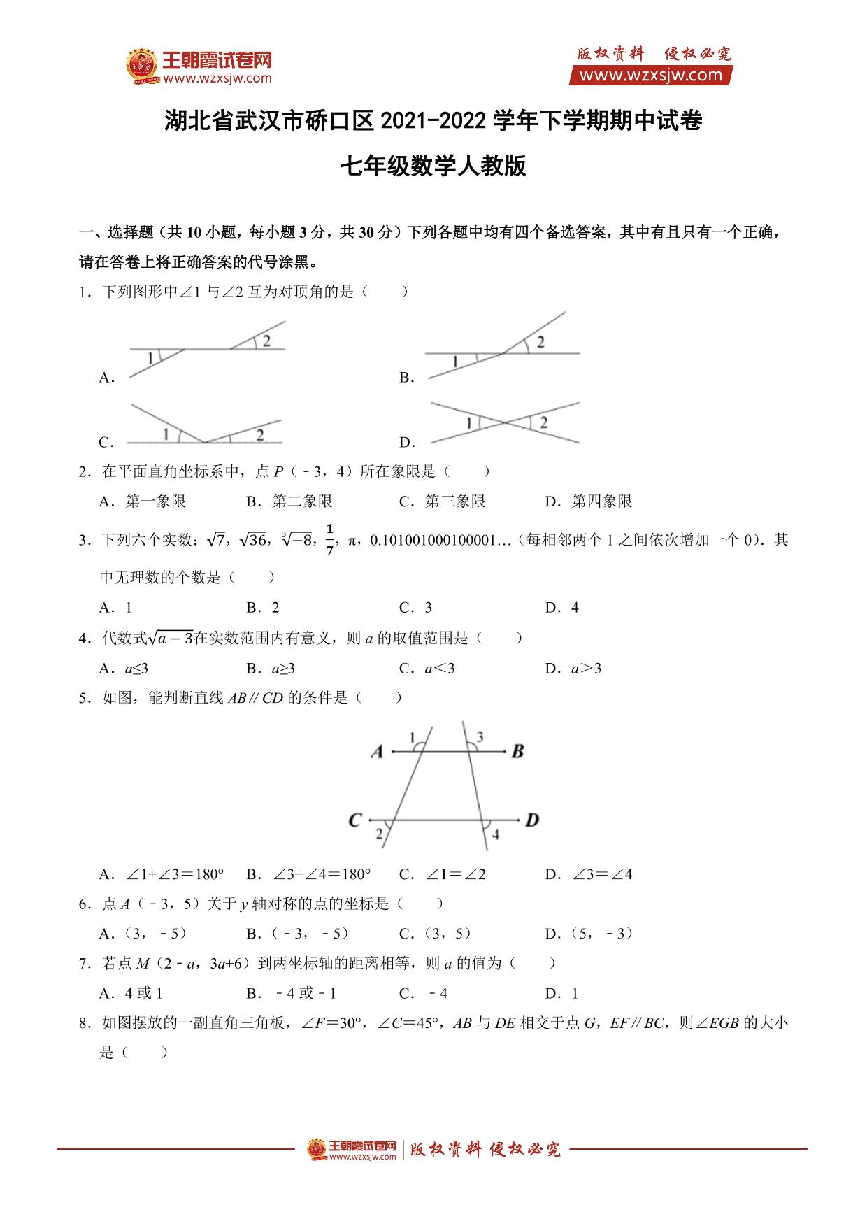 湖北省武汉市硚口区2021-2022学年下学期期中试卷七年级数学(人教版)