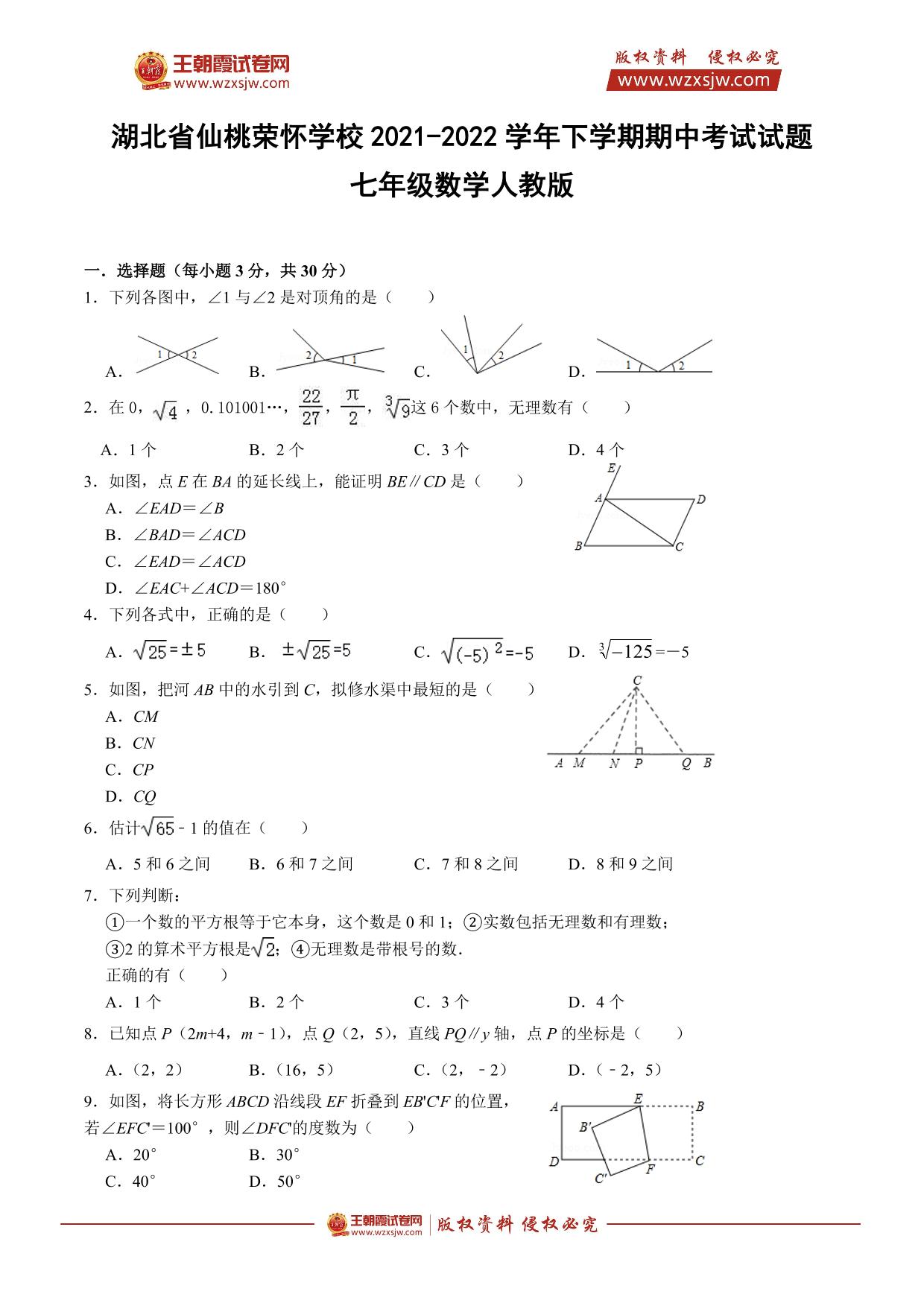 湖北省仙桃市荣怀学校2021-2022学年下学期期中考试试题七年级数学(人教版)