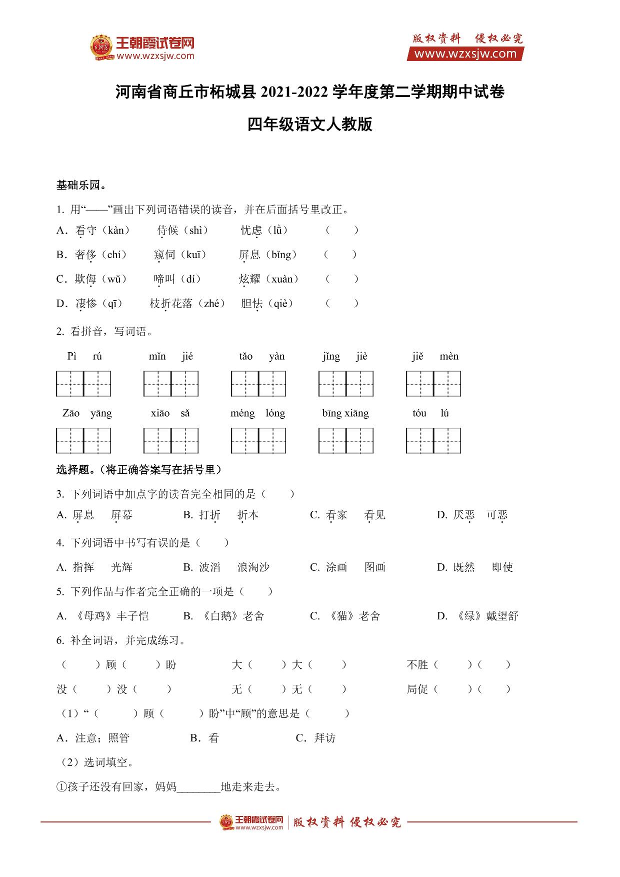 河南省商丘市柘城县2021-2022学年度第二学期期中试卷四年级语文(人教版)