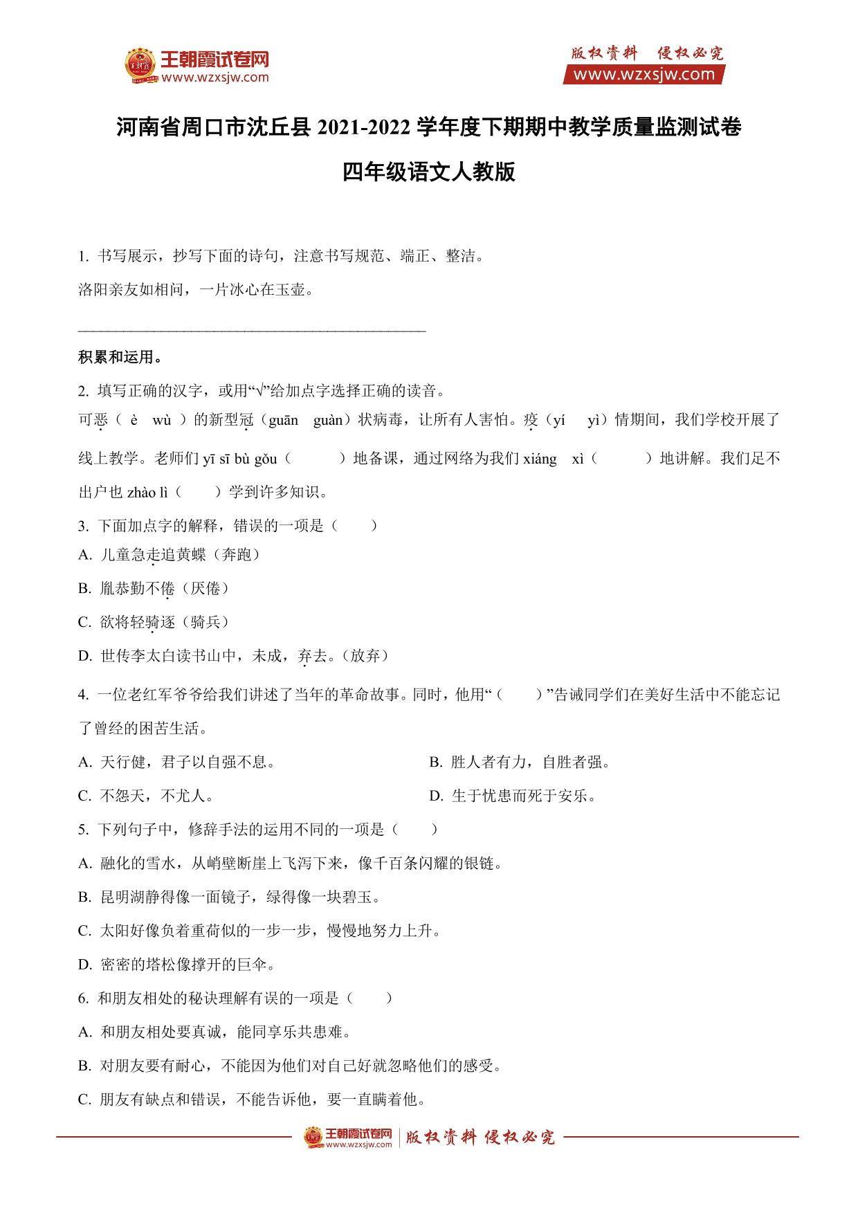 河南省周口市沈丘县2021-2022学年度下期期中教学质量监测试卷四年级语文(人教版)