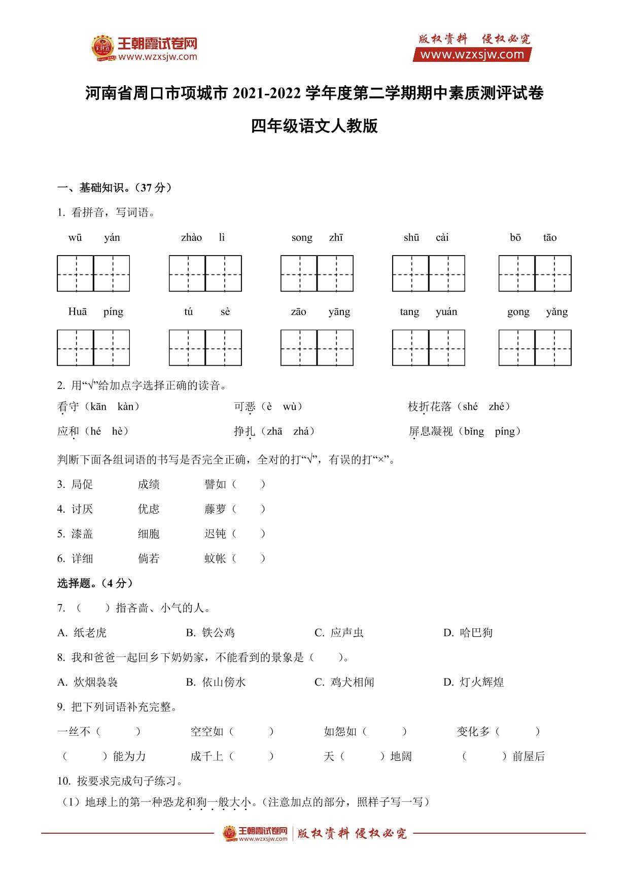 河南省周口市项城市2021-2022学年度第二学期期中素质测评试卷四年级语文(人教版)