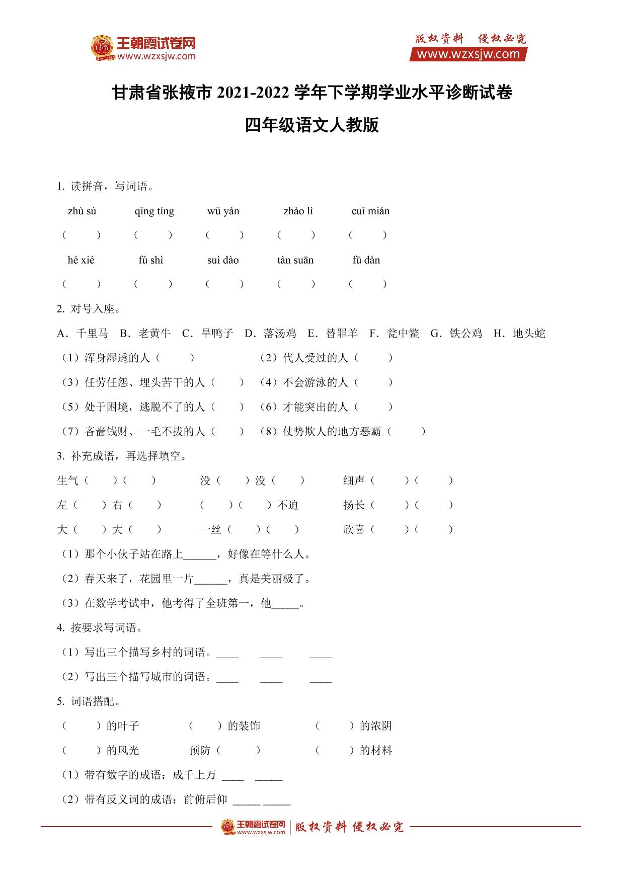 甘肃省张掖市2021-2022学年下学期学业水平诊断试卷四年级语文(人教版)