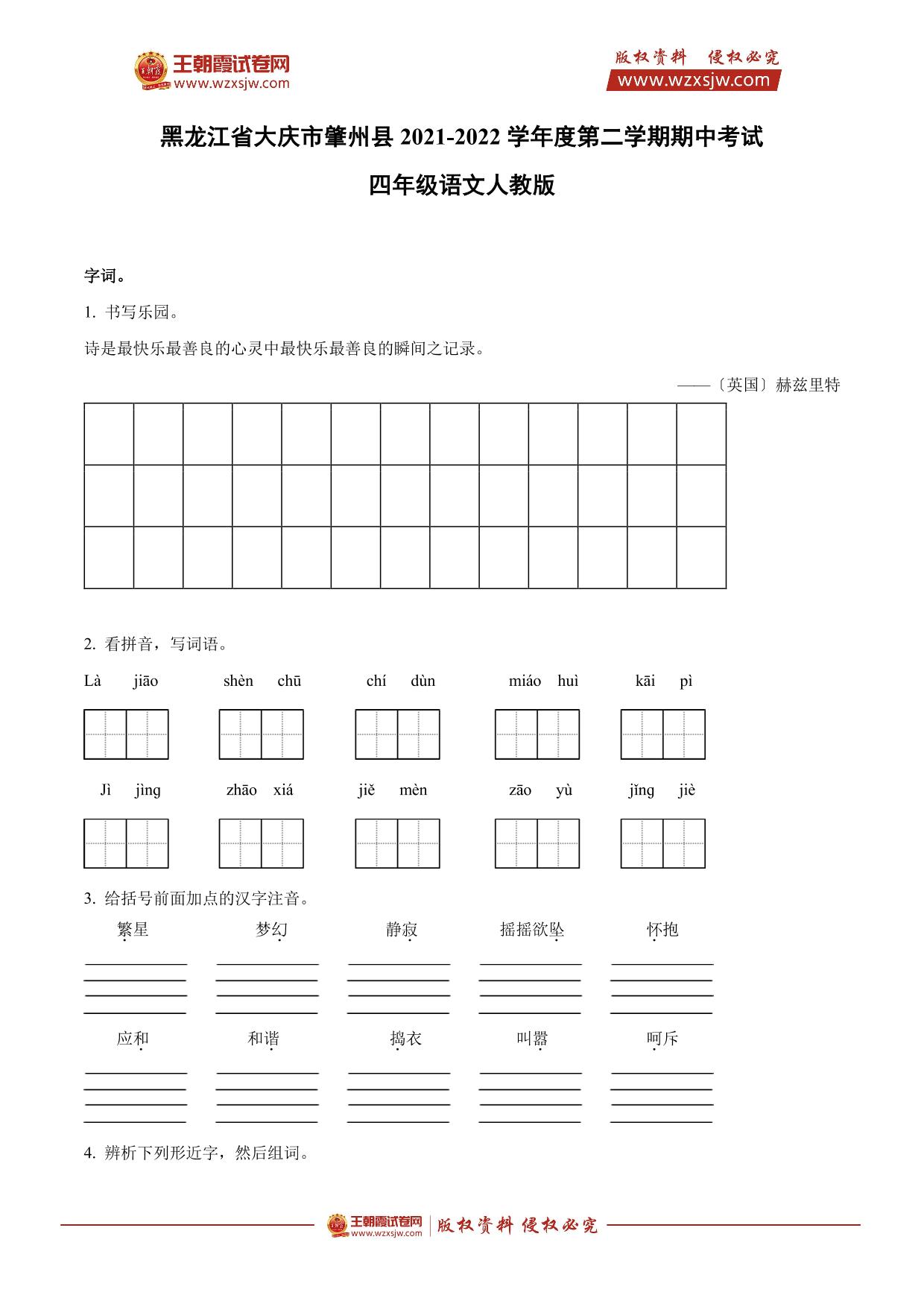 黑龙江省大庆市肇州县2021-2022学年度第二学期期中考试四年级语文(人教版)