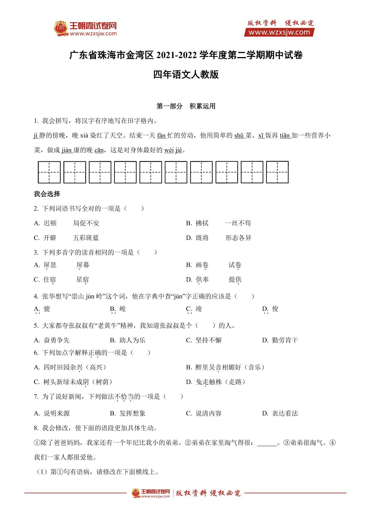 广东省珠海市金湾区2021-2022学年度第二学期期中试卷四年级语文(人教版)