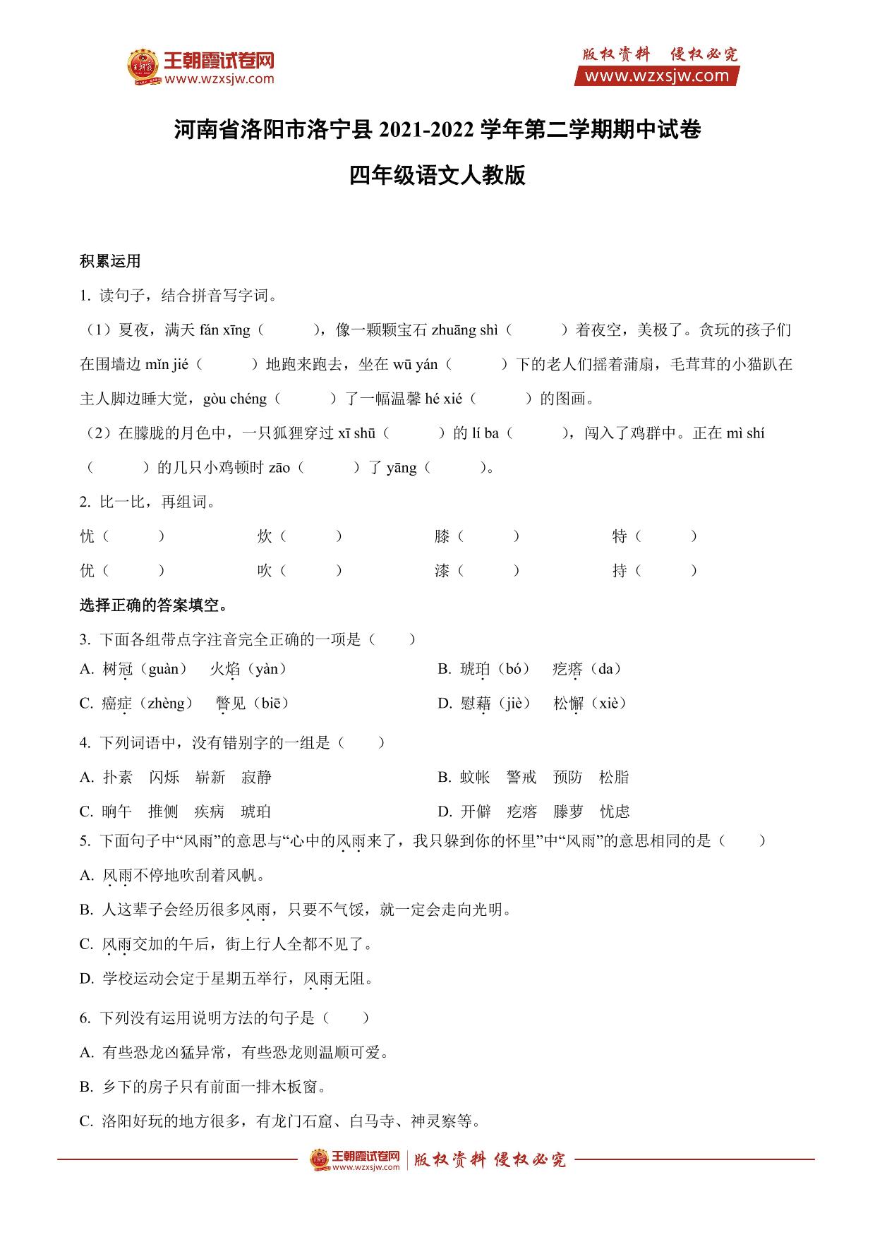 河南省洛阳市洛宁县2021-2022学年第二学期期中试卷四年级语文(人教版)